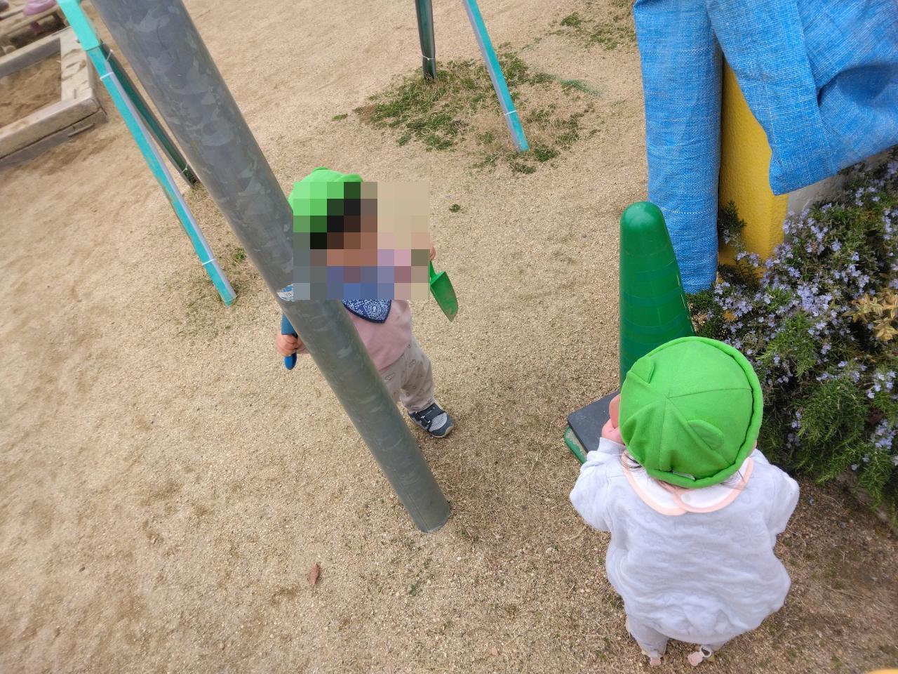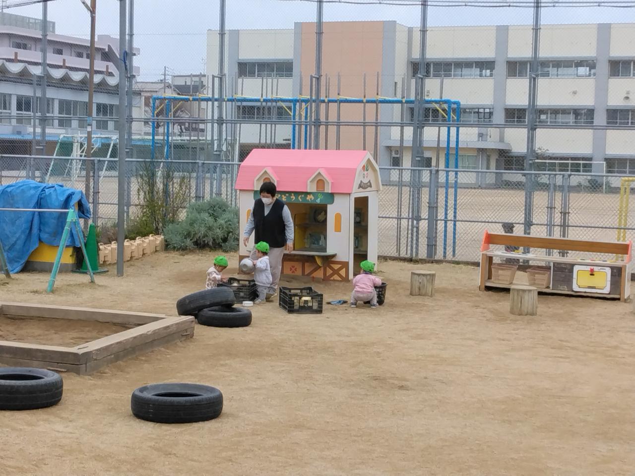 園庭遊び:雨の予報が出ていたので、降ってくる前に園庭遊びをしよう!ほかのクラスより早く出て遊びました。砂遊びの容器をカチャカチャと選んで、音を楽しんだり形の違いを見て楽しみます。