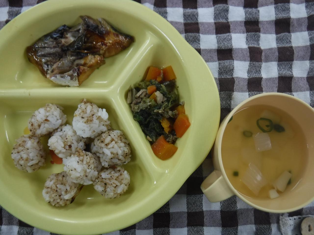 離乳完了期昼食:手作りふりかけ一口おにぎり 魚の煮付け 若ごぼうと豚肉の煮物 すまし汁