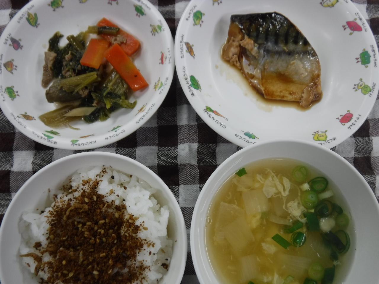 普通給食2歳児量:手作りふりかけごはん 鯖の煮付け 八尾ごぼうと豚肉の煮物 かきたま汁