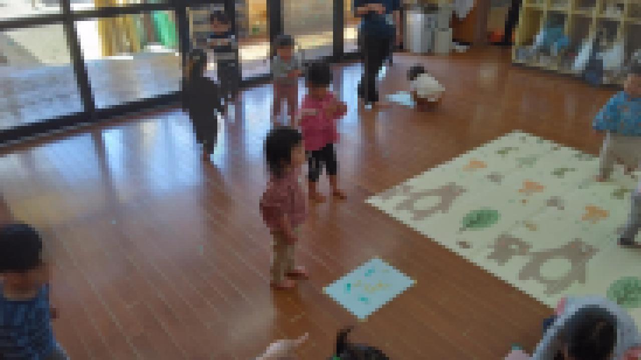 室内でシール遊びをする。シールを剥がして、紙に貼る事が難しく、シールが丸まったりし苦戦する姿が見られましたが、集中して取り組んでいました。