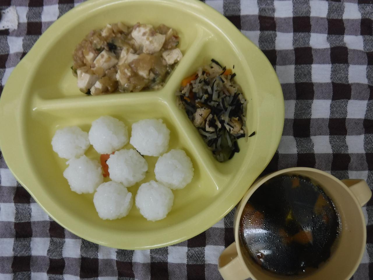 完了食:給食 一口おにぎり 麻婆豆腐 ひじきと糸こんにゃくの煮物 中華スープ