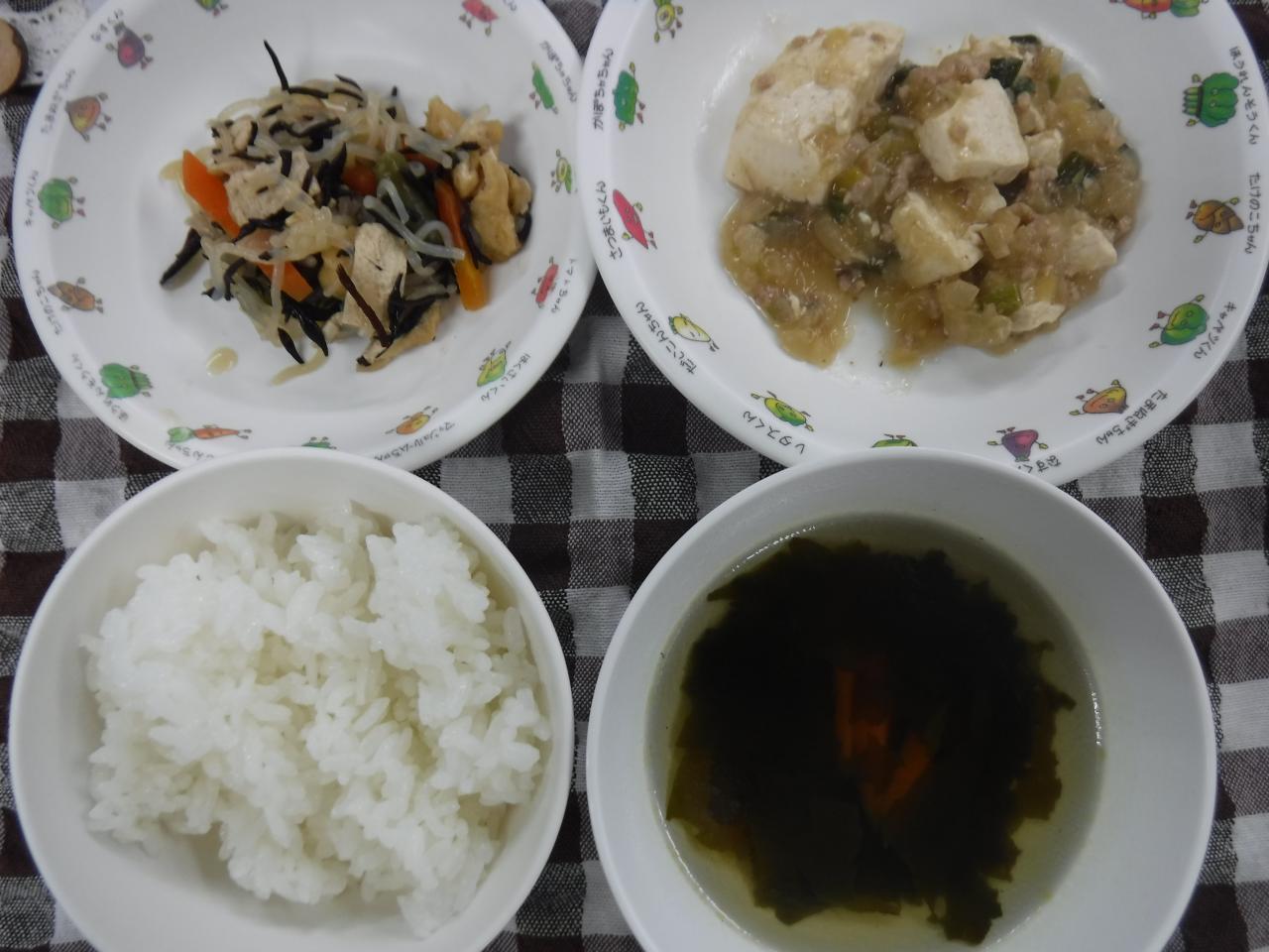 給食:ごはん 麻婆豆腐 糸こんにゃくとひじきの煮物 中華スープ