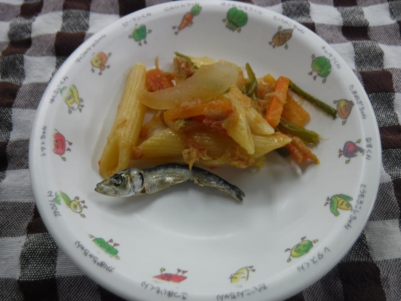 おやつ:炒り煮干し ペンネのアラビアータ風