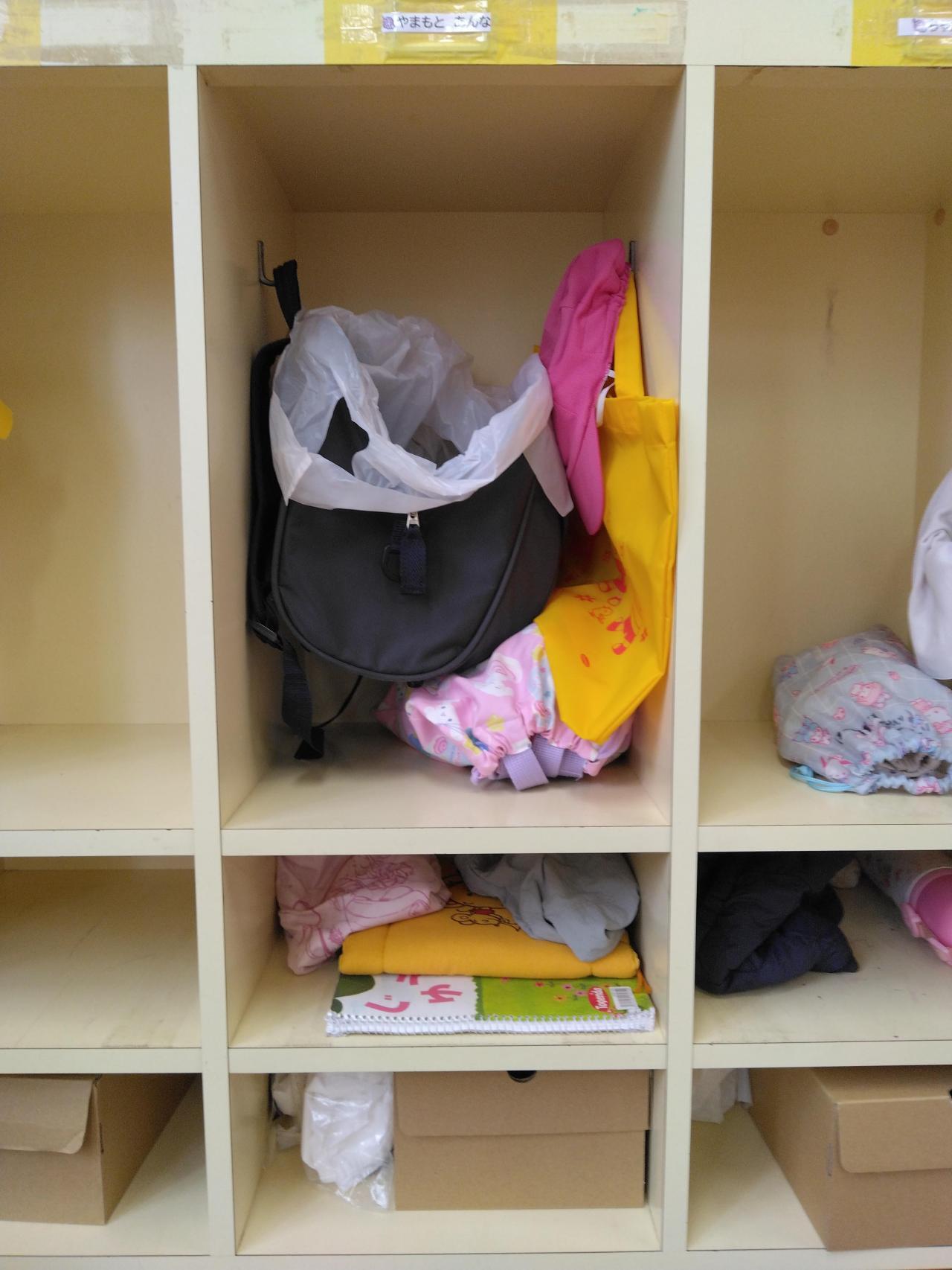 子どもたちと一緒に、改めてロッカーの使い方を確認しました。下の写真のように置きますので、慣れるまで朝のご用意一緒にしてあげてくださいね。