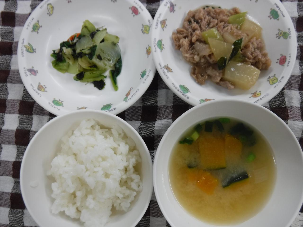 給食:ごはん 大根と豚肉の煮物 野菜ののり和え かぼちゃの味噌汁