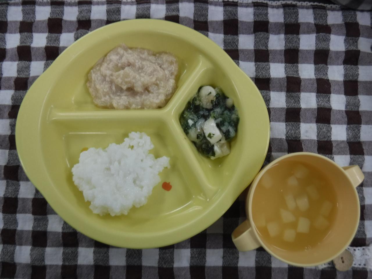 離乳食:後期食 軟飯 治部煮 青菜と豆腐の煮物 じゃが芋の味噌汁