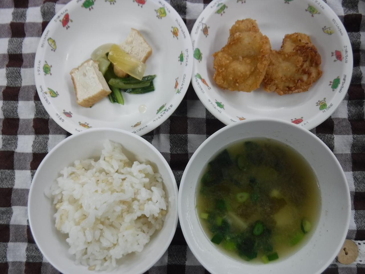 給食:発芽玄米入りご飯 鶏肉の竜田揚げ 青梗菜と厚揚げの煮浸し 長芋とわかめの味噌汁