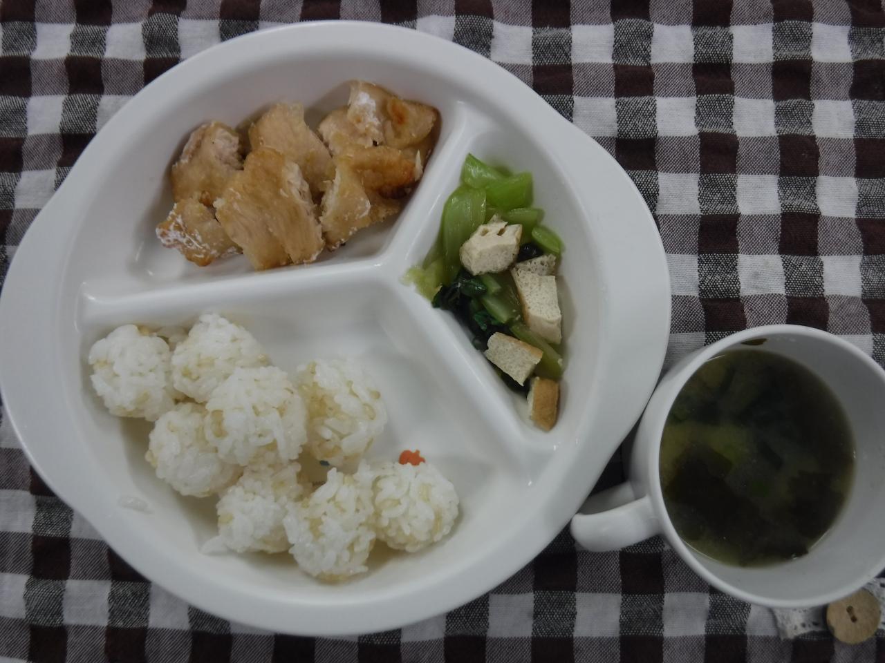 完了食:給食 一口おにぎり発芽玄米入り 鶏肉の竜田蒸し焼き 青梗菜と厚揚げの煮浸し 山芋とわかめの味噌汁