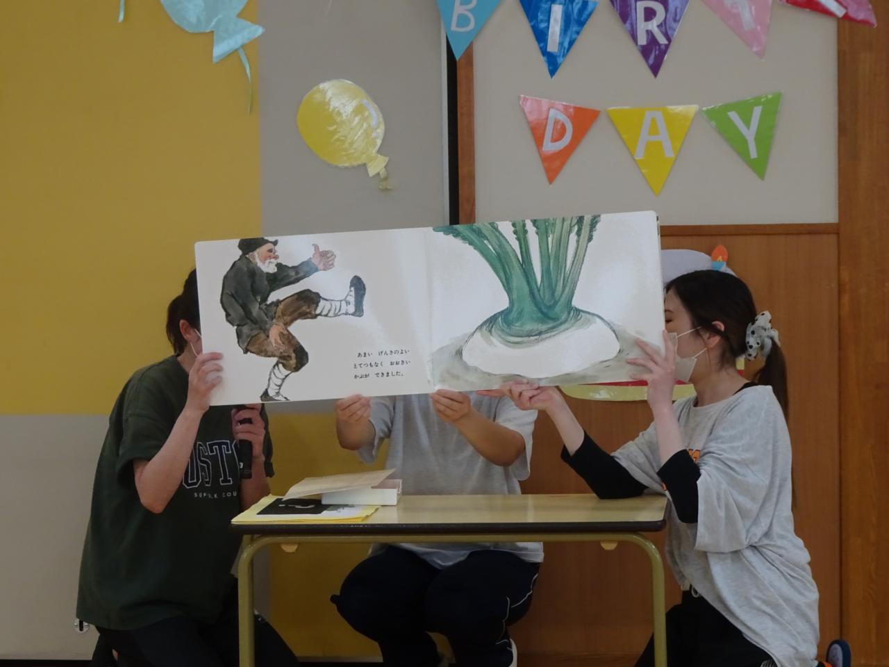 おおきなかぶを抜くシーンでは、皆が「うんとこしょ、どっこいしょ」と掛け声をして応援してくれたので、無事におおきなかぶが抜けましたよ👏