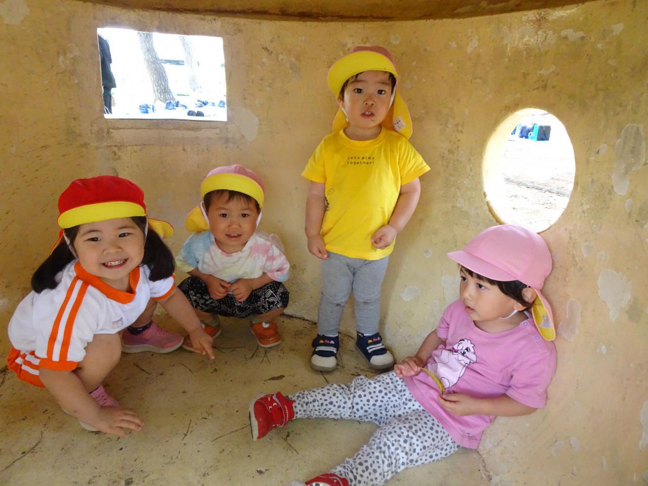 キノコのお家に入ったり、ライオンの上に乗ったり、おいかけっこなどをしてとても楽しそうな子どもたちでしたよ😄