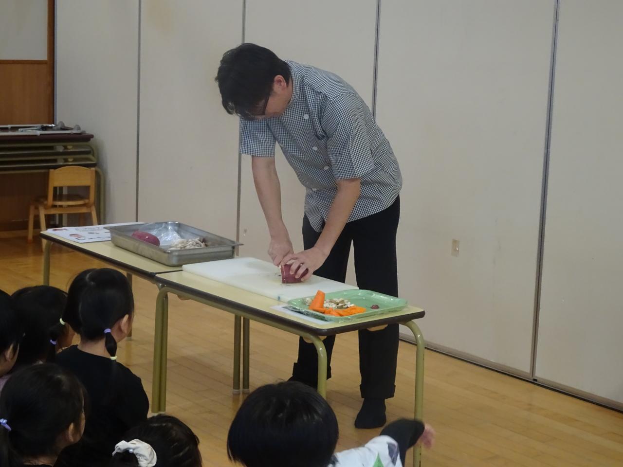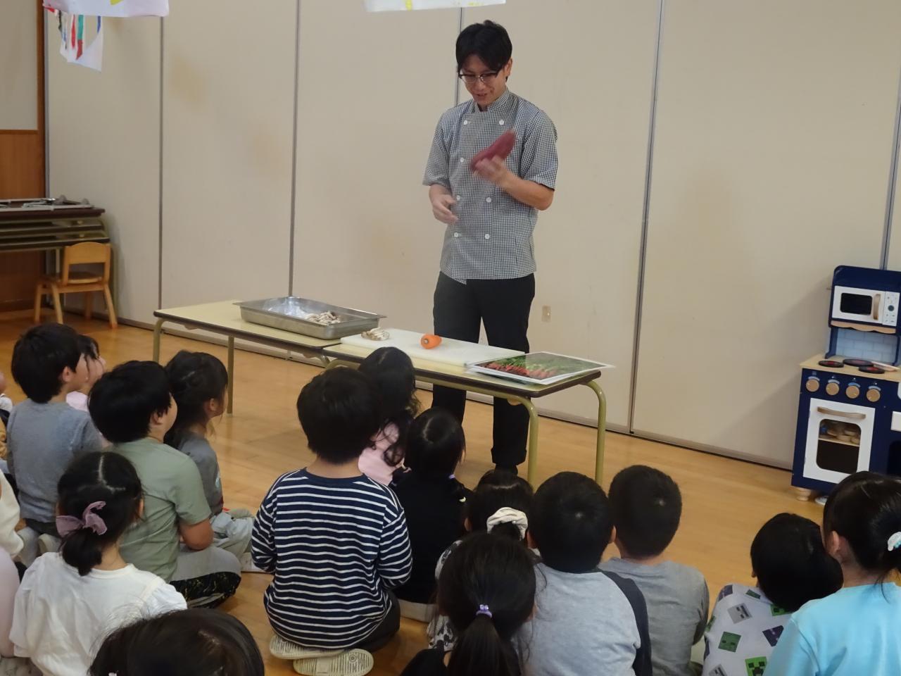 お話の後は実際に野菜を切って断面を見せてくれたり、短冊切り、千切り、いちょう切りを披露してくれ野菜に興味津々の子ども達でしたよ😄
