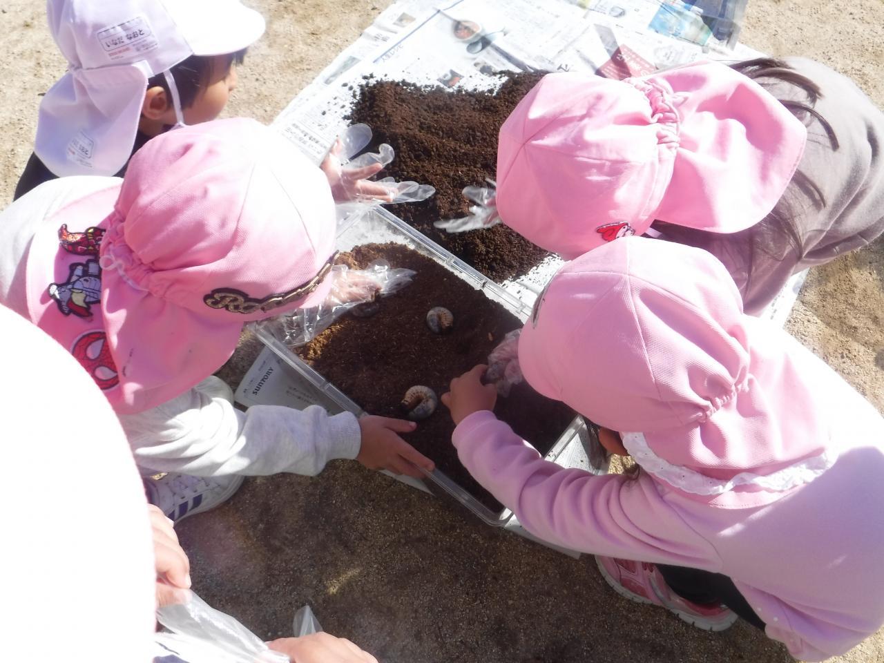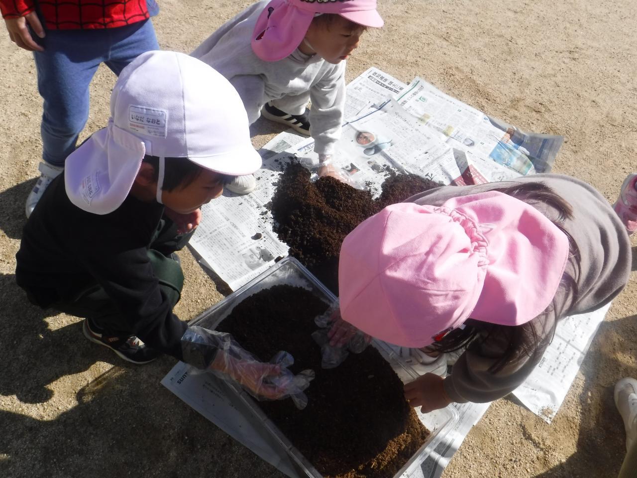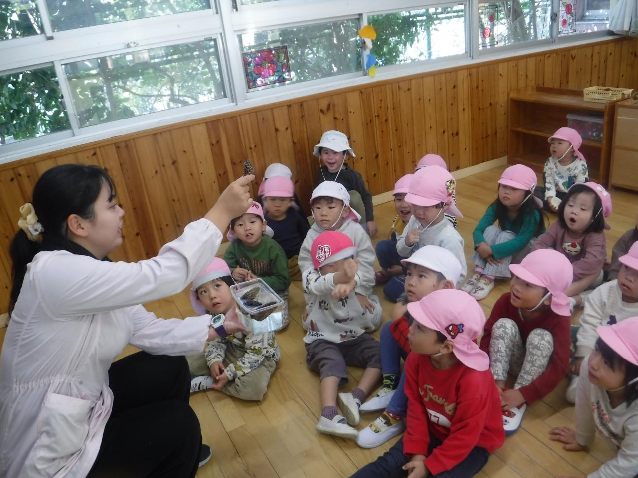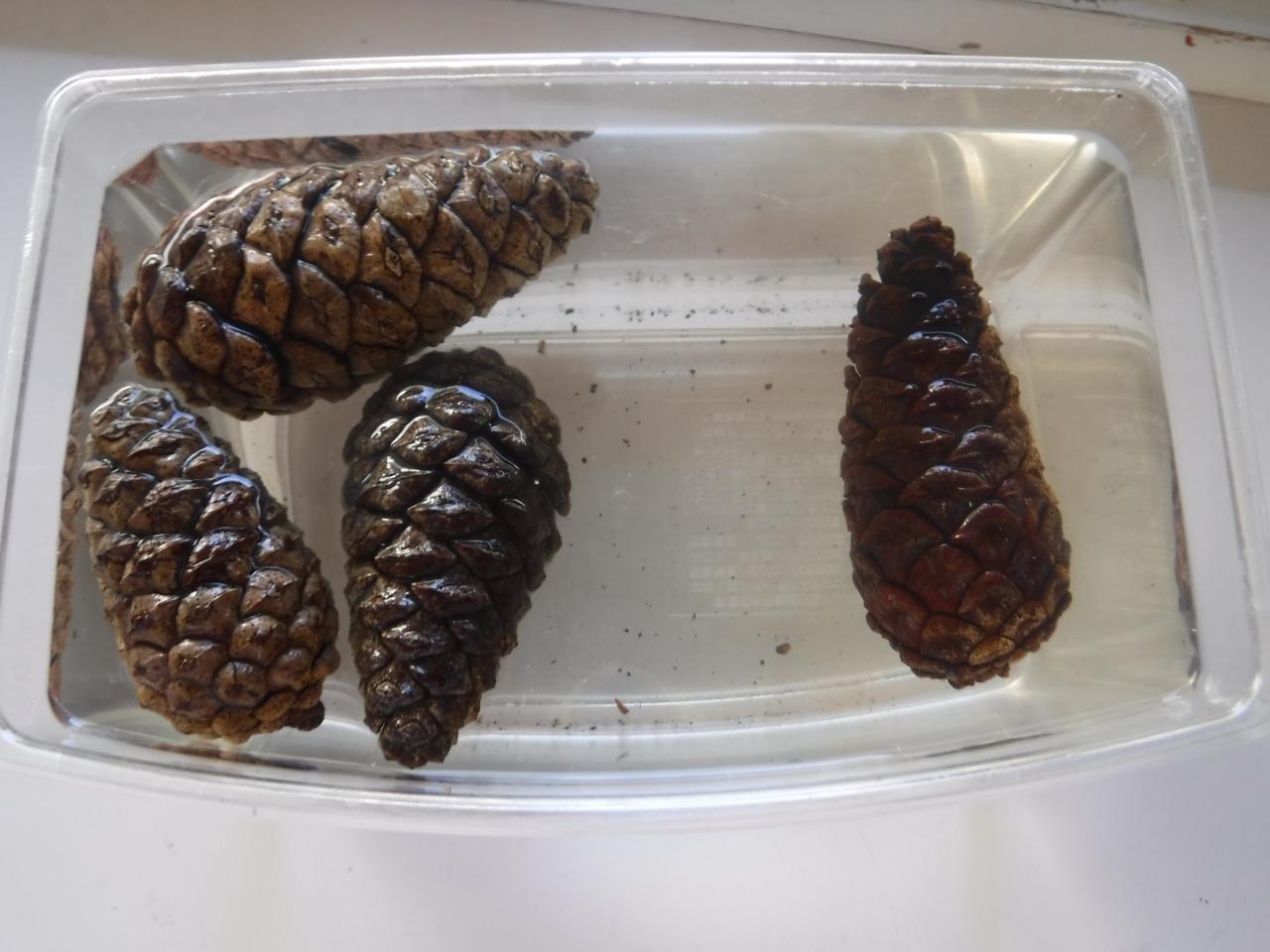〇子どもたちは登園すると、「昨日の松ぼっくりのどうなったかな?」と観察する姿が見られました。「小さくなっている!」「縮んでいるね!」と話していました。次に子どもたちは、なぜ小さくなったのか疑問を持ち始めました。「松ぼっくりを水に入れると小さくなるのは、なんでなの?」とお家の人に聞いてきてね!宿題だよ!と伝えていますので、ぜひお家でも話してみてくださいね!