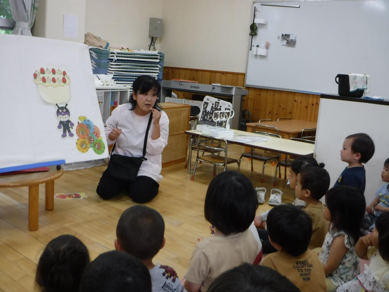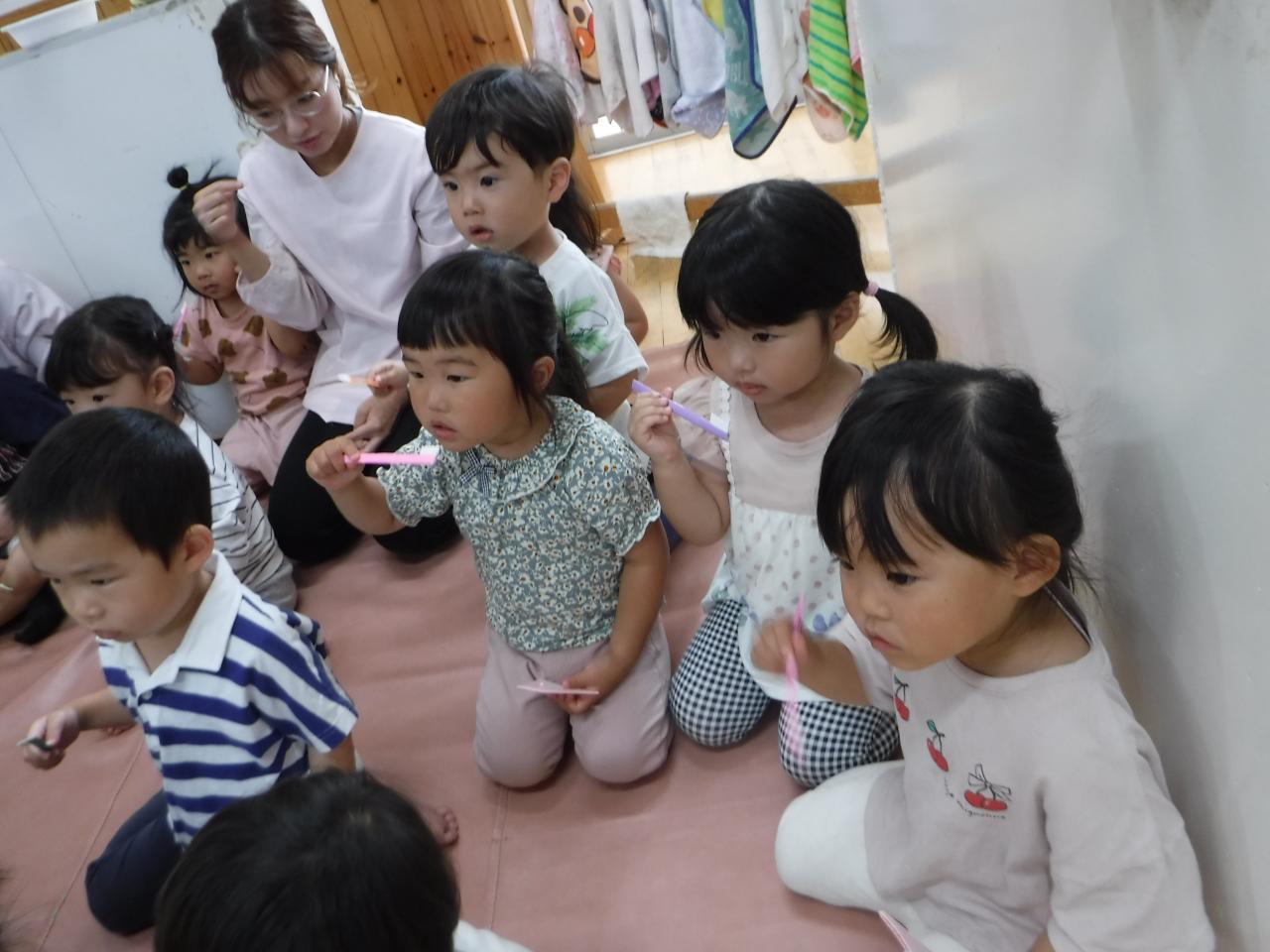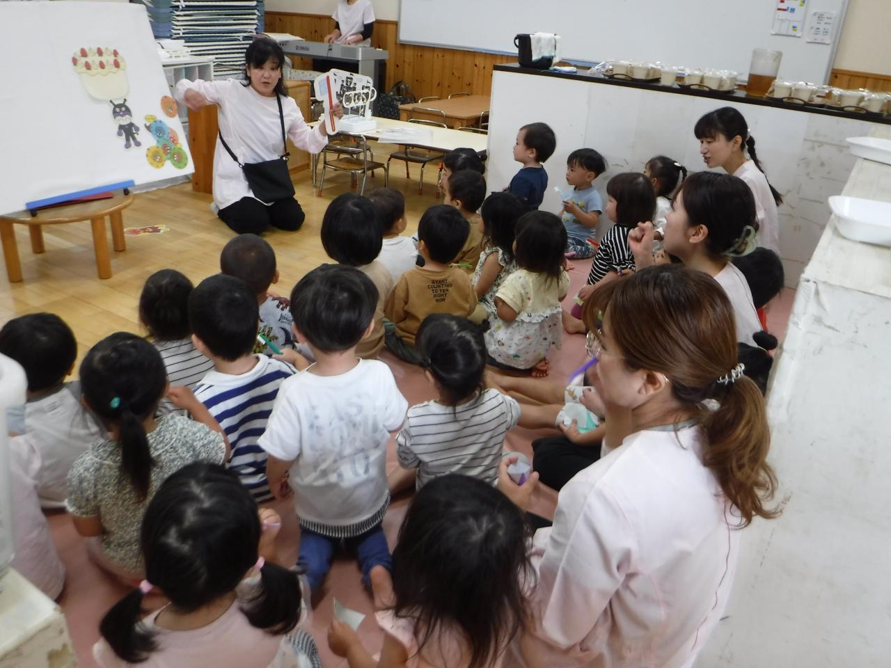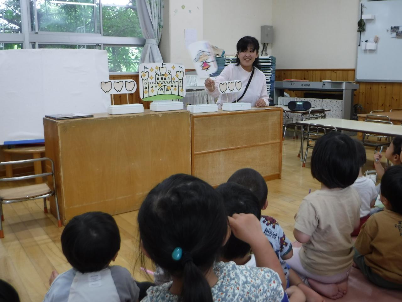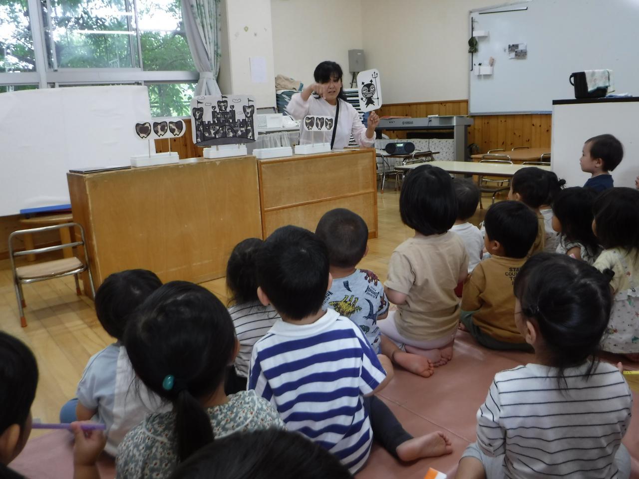 今日は6月4日「虫歯予防デー」で、ペープサートやパネルシアターを使って歯の大切さについてみんなで考えました。