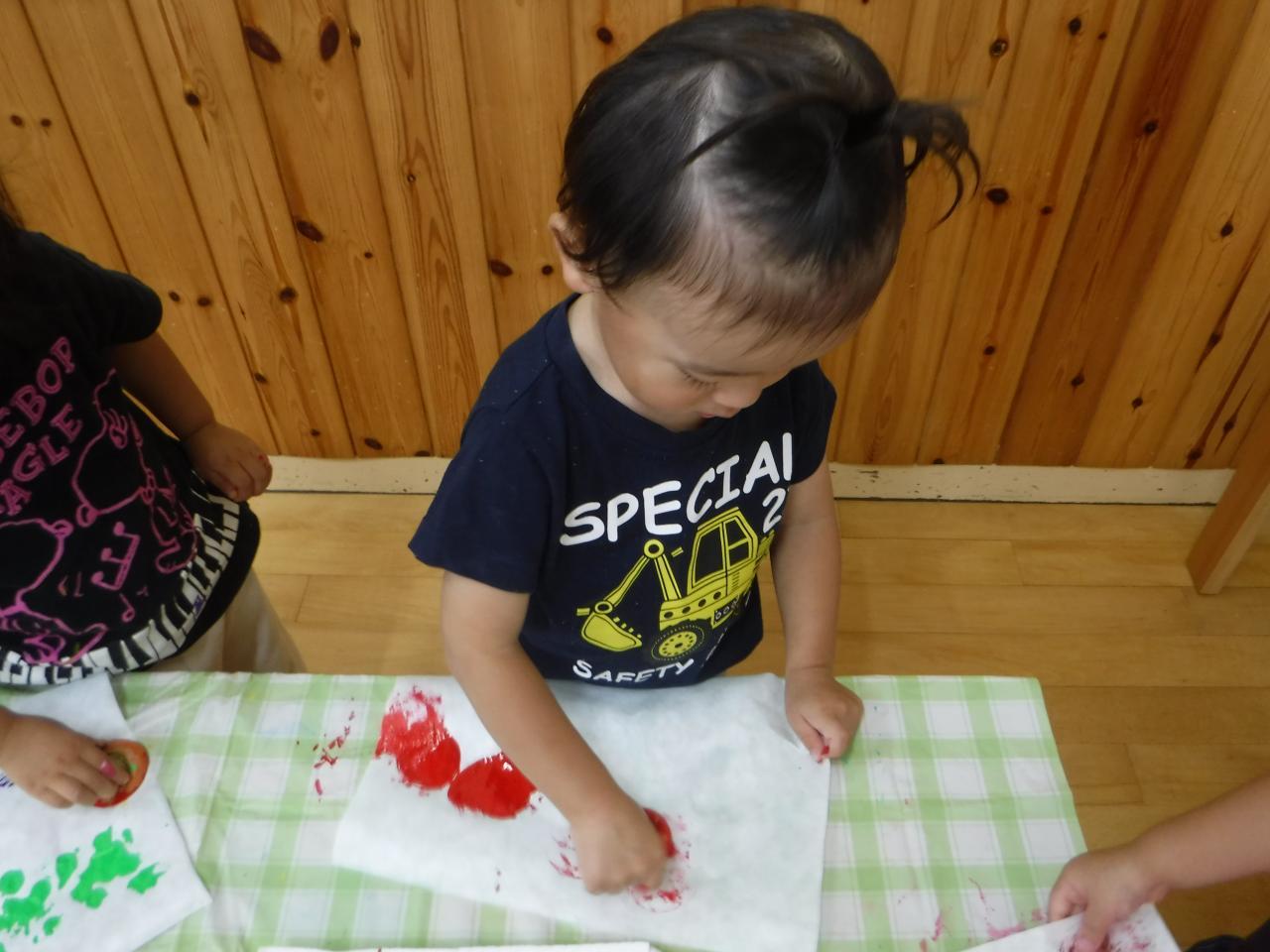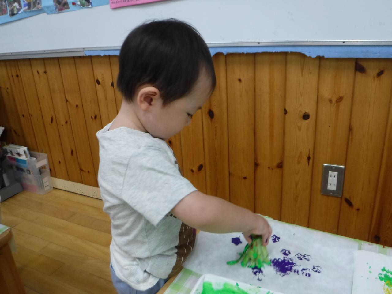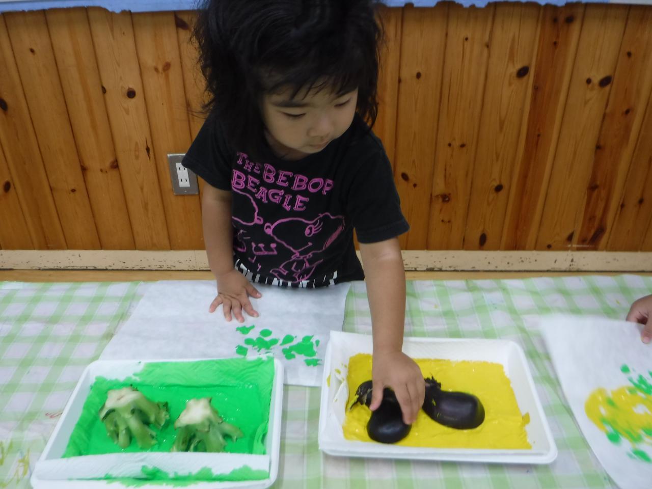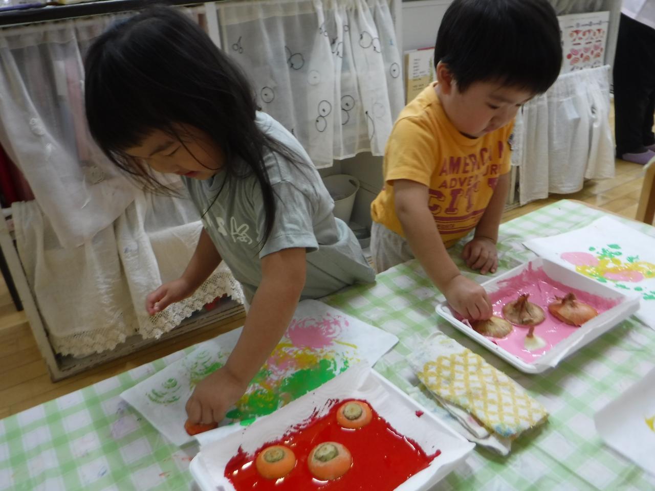 野菜スタンプを始める前に野菜を触ったり匂いをかいだりと野菜の感触を楽しむ姿や、野菜の色や形に興味をもつ姿がみられましたよ!