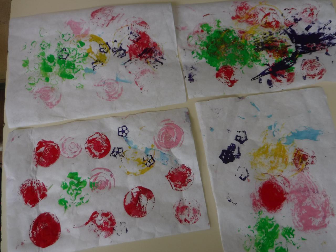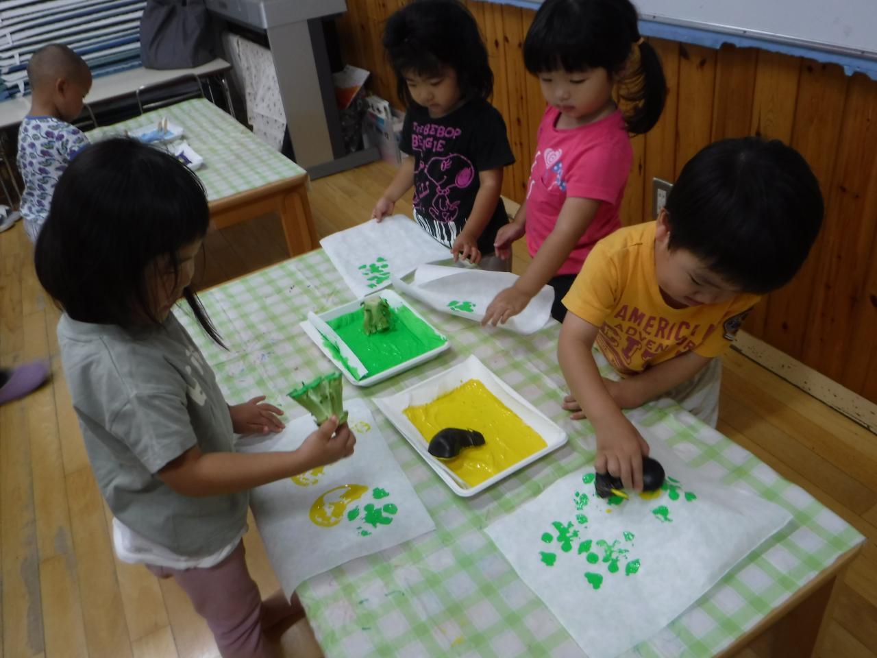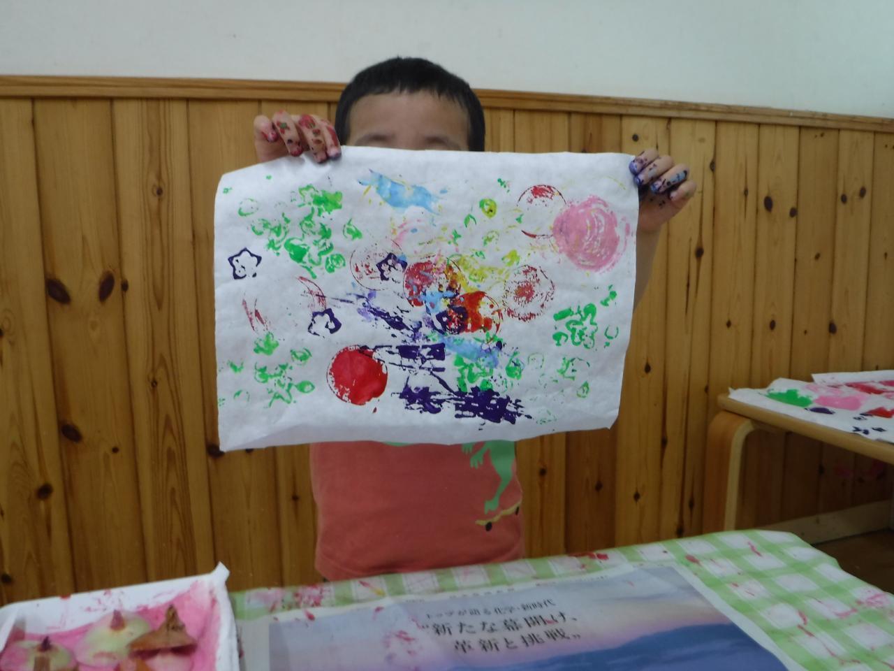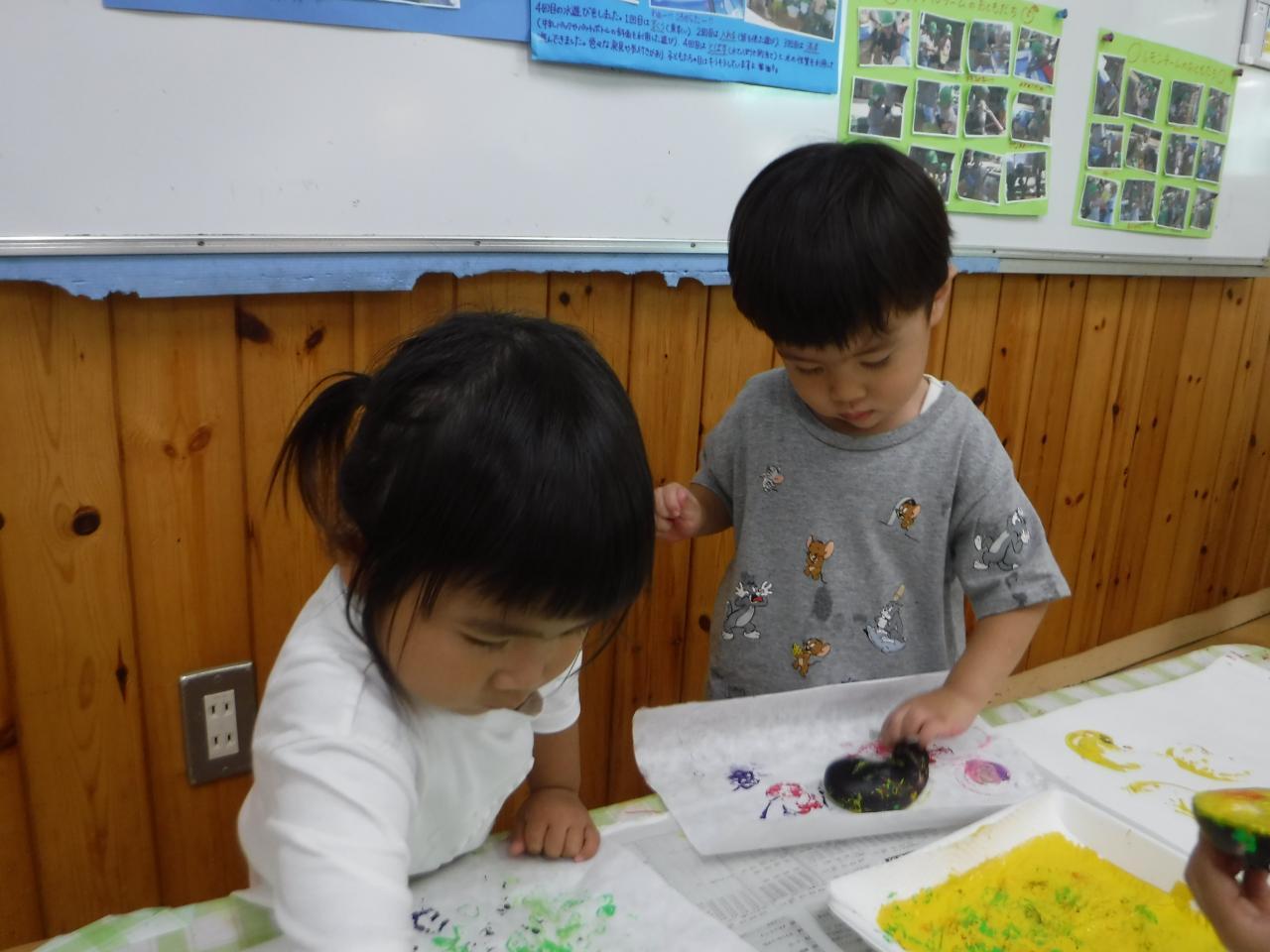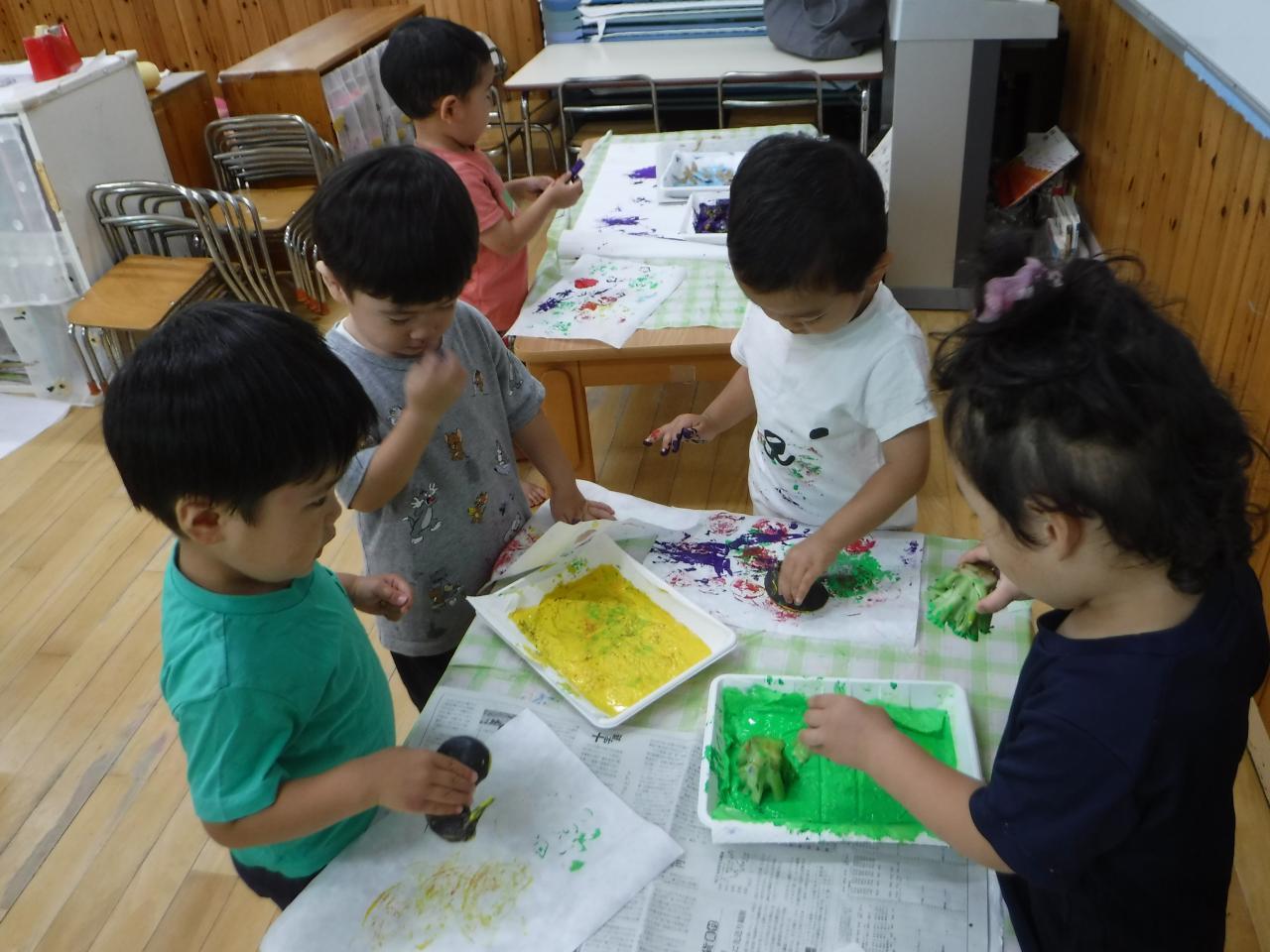今日はつき組さんが育てているナスとパプリカと、たんぽぽ組で育てているオクラ、そして調理の先生から調理の際に出た野菜の切れ端をいただいて、野菜スタンプをしました
