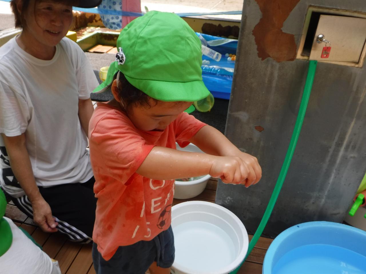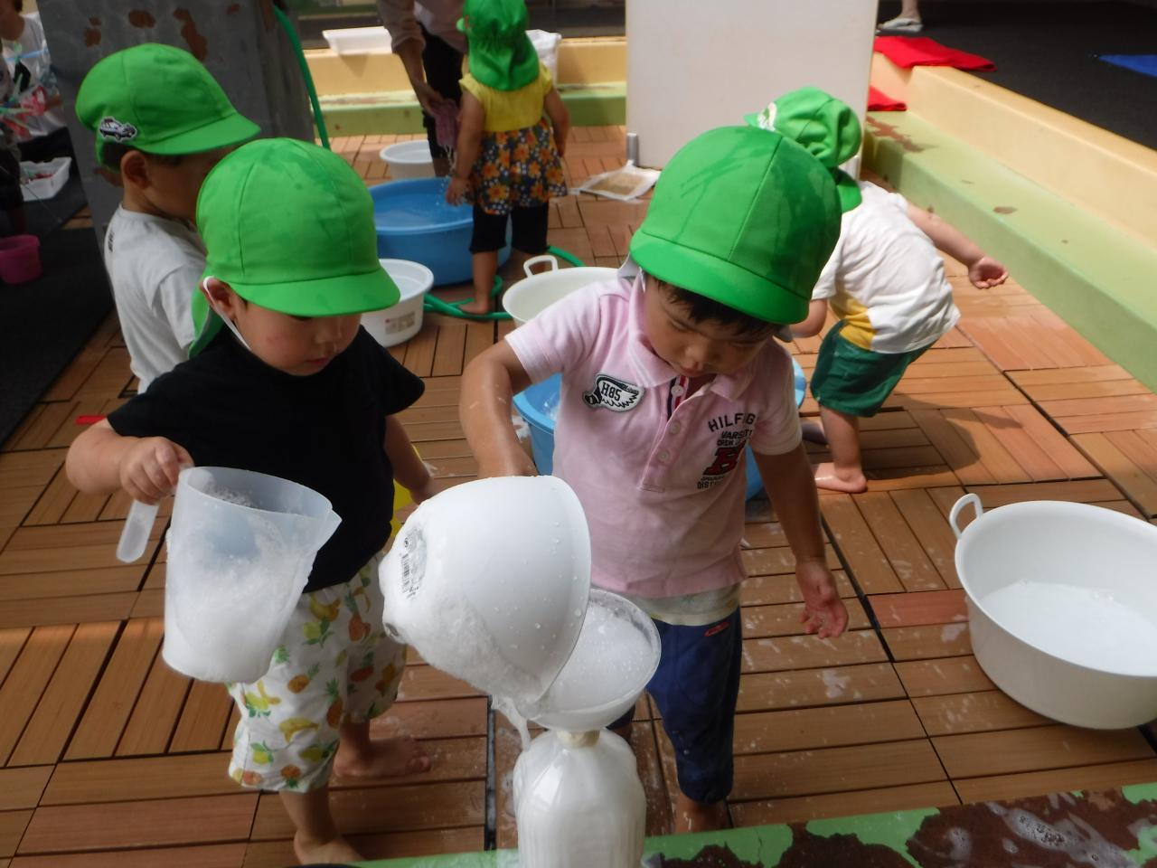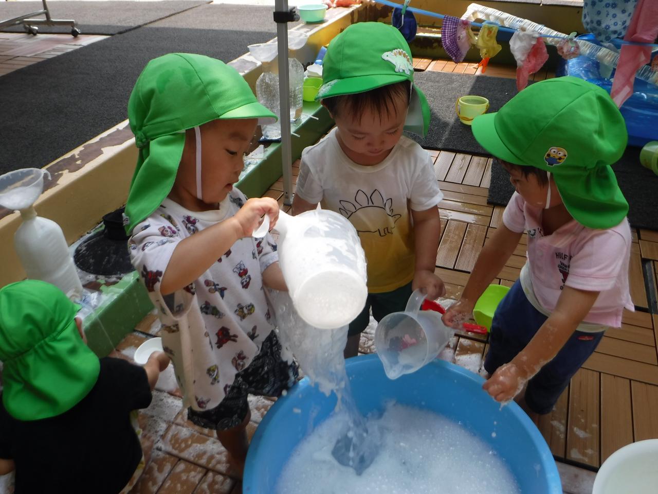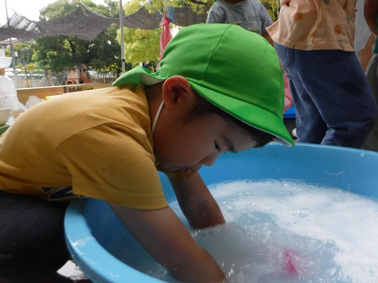 泡の感触を楽しんだり、泡をかき混ぜてみたり、洗濯機みたいにぐるぐる回してみたりと、思い思いに楽しんでいました