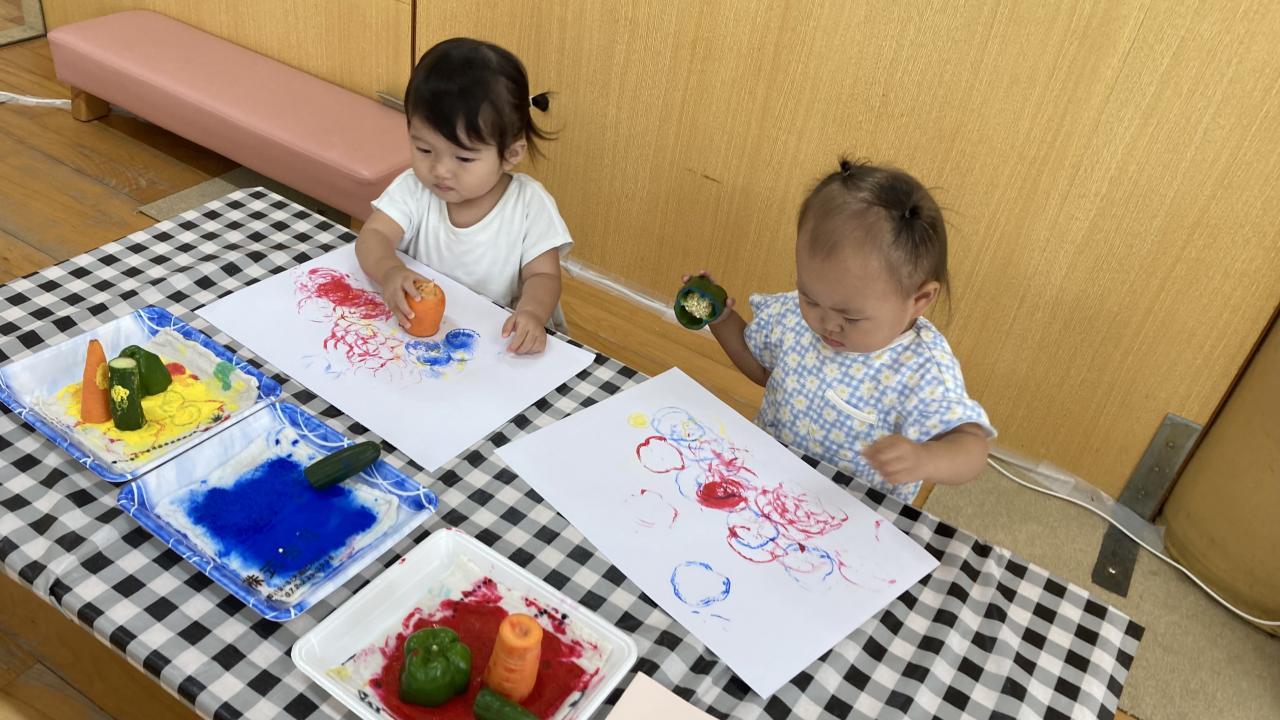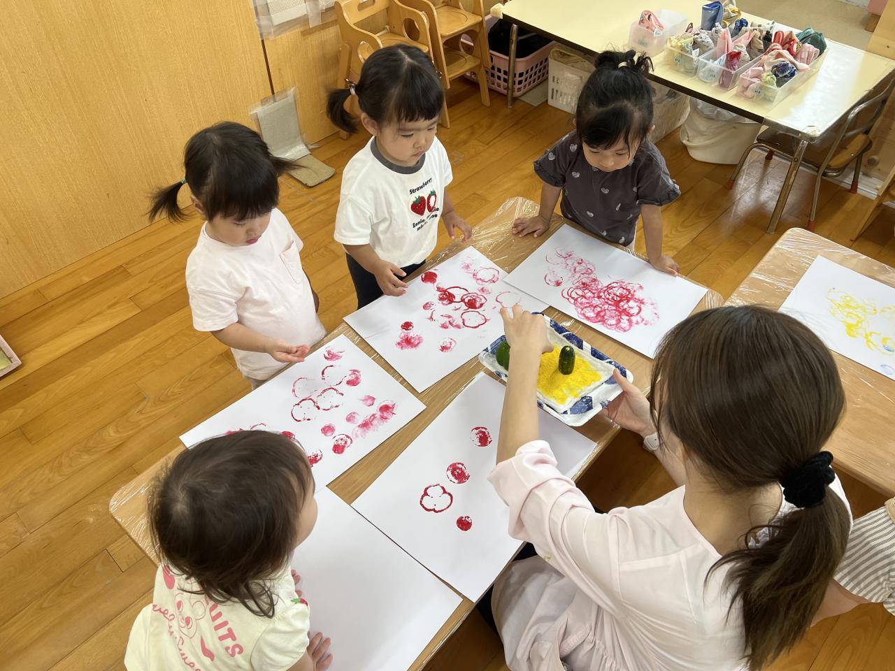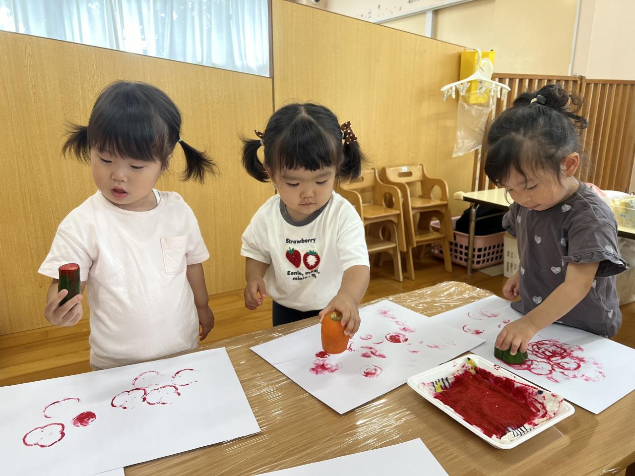 今日は食育で、「野菜スタンプ」をしました。