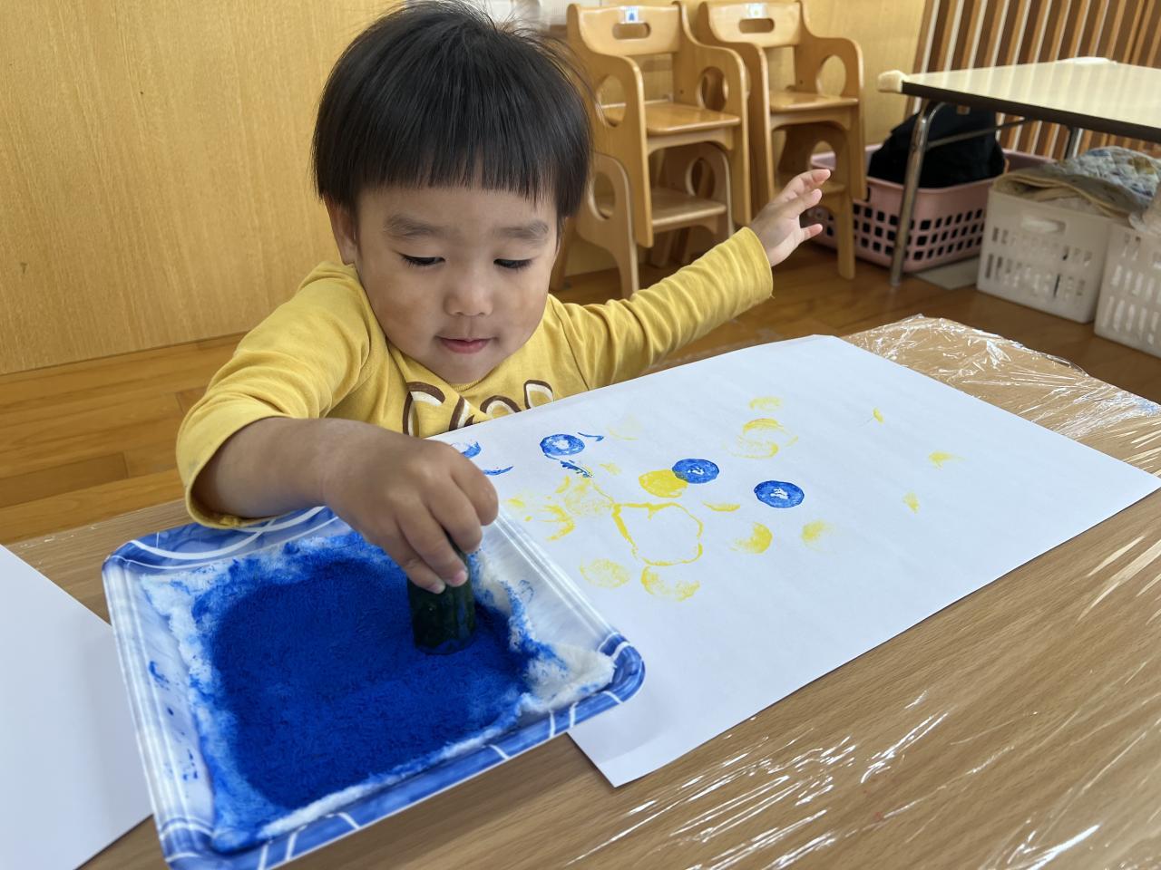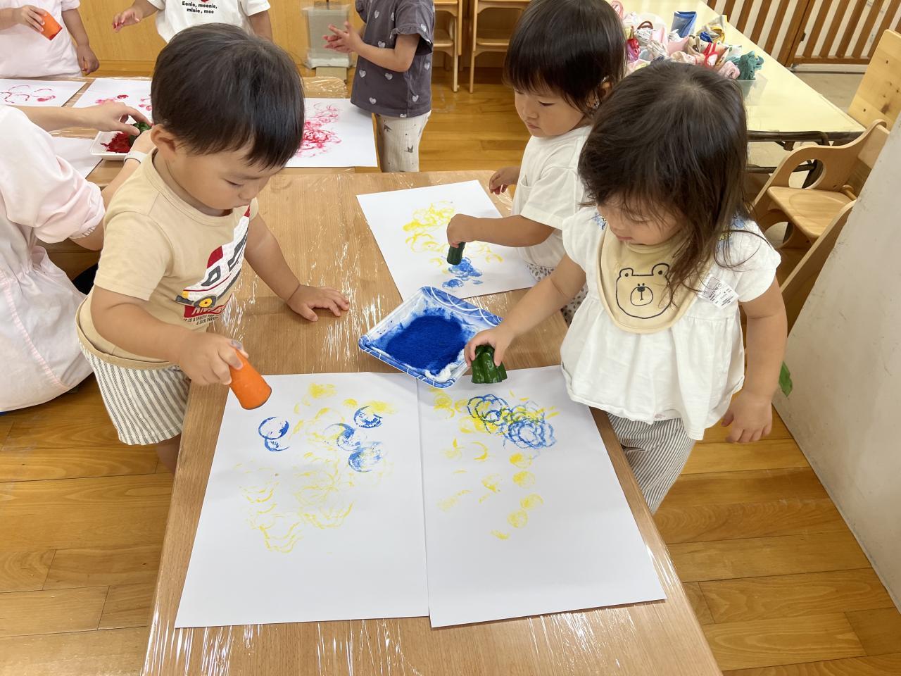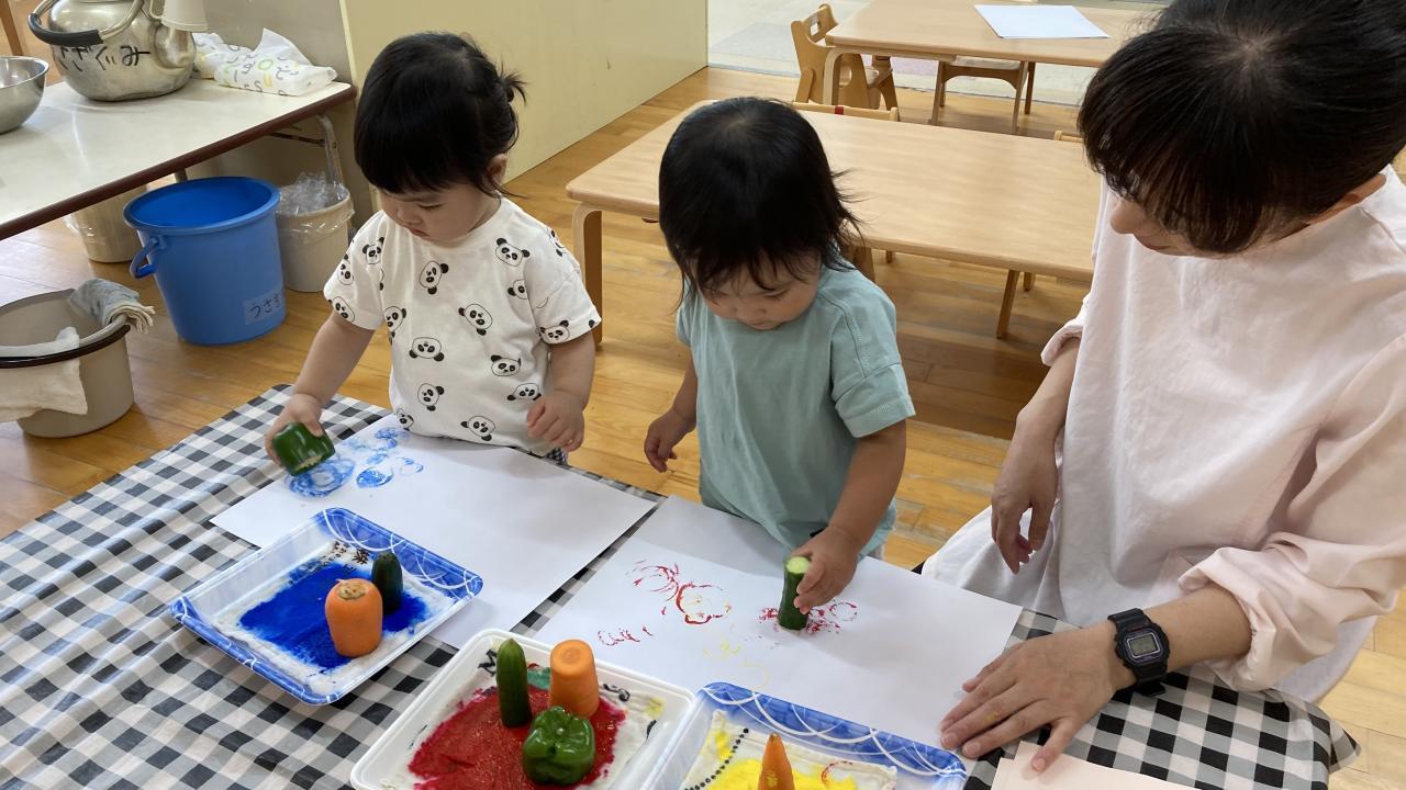 今日は食育で、「野菜スタンプ」をしました。