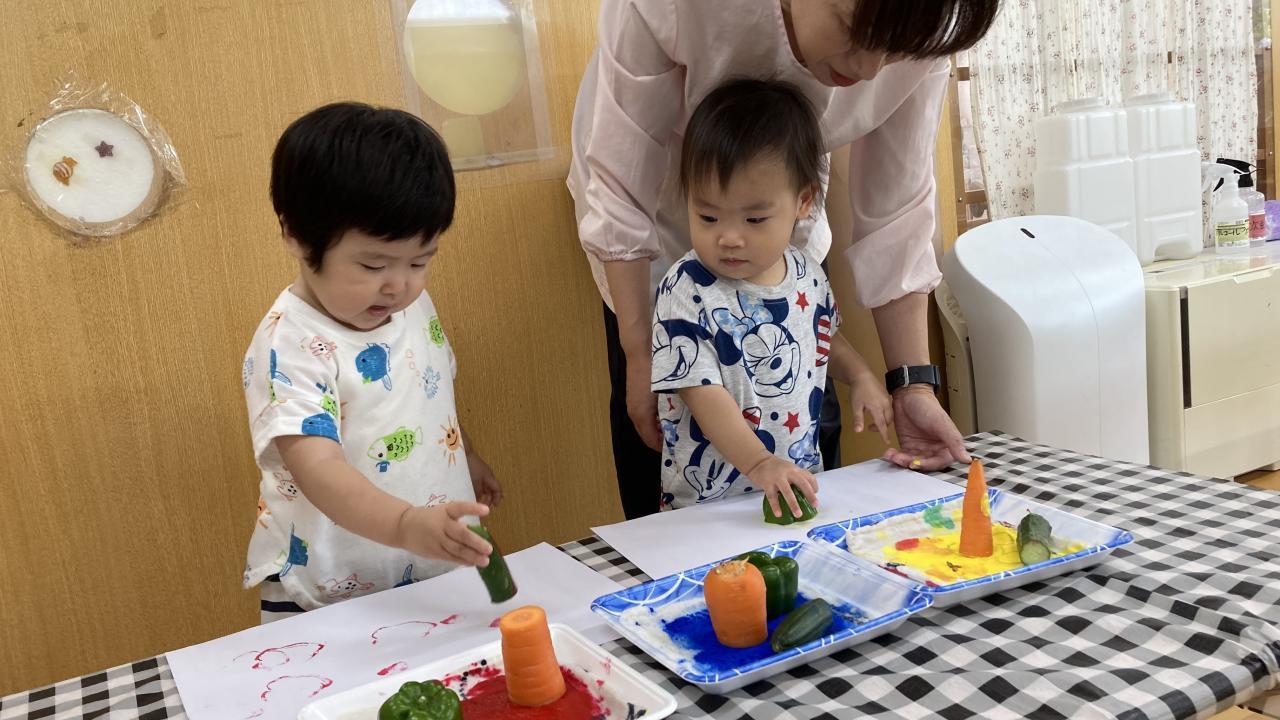 「きゅうりー」「ピーマン」と言いながら、「野菜のおなか」に興味を持ち、スタンプを押していました。