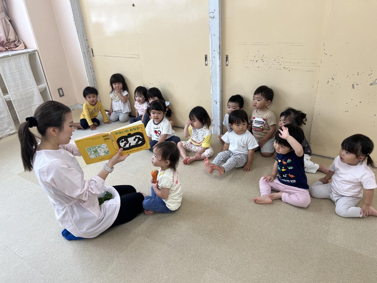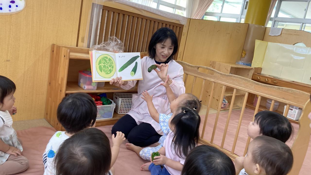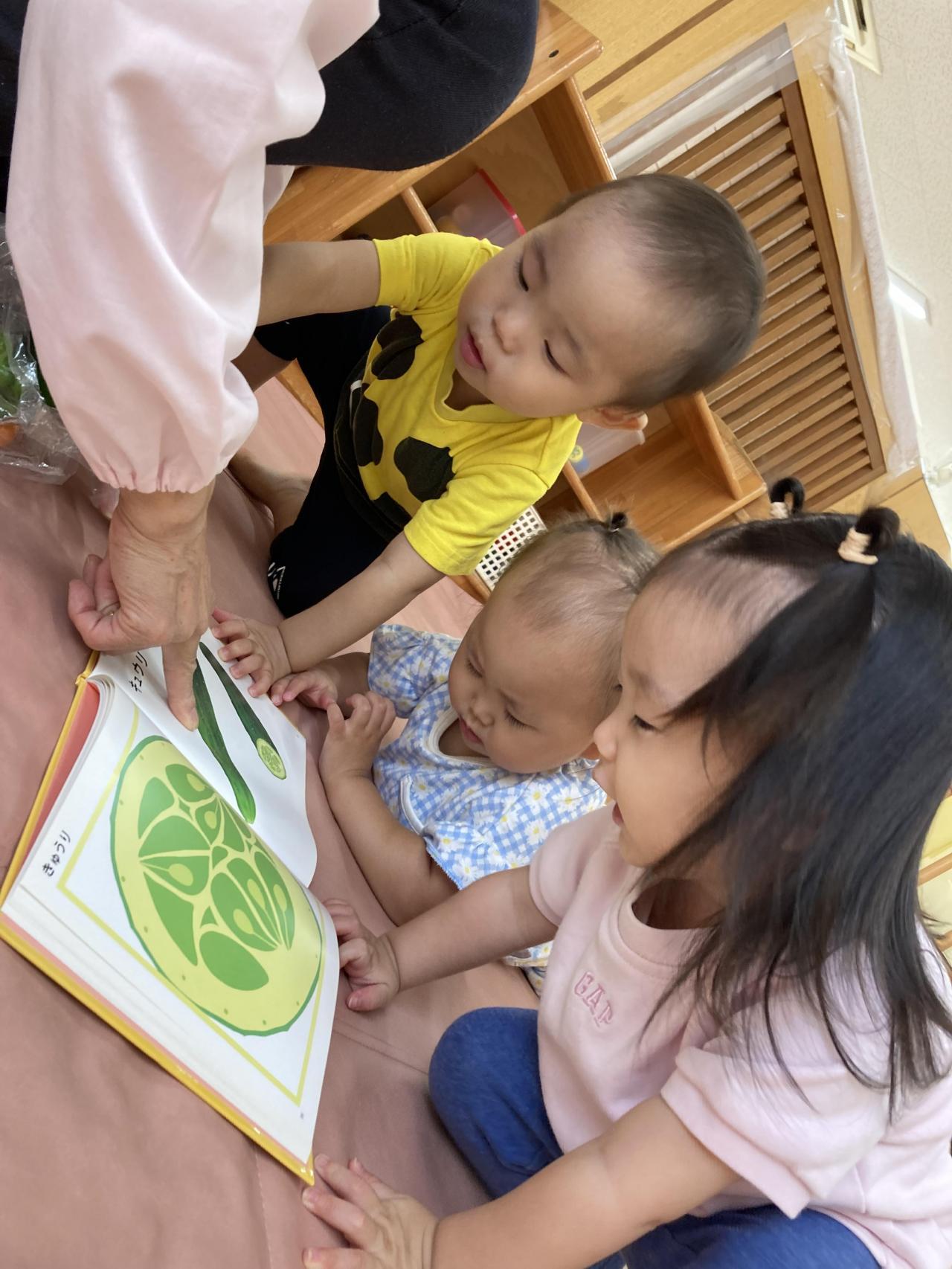 はじめに「やさいのおなか」という絵本を見ました。子ども達にとって身近な、きゅうり、にんじん、ピーマンどれかなー??探してみました。その後、実際に野菜を手に取って見ました。絵本の絵をみて「いっしょ」と伝える姿がありました。
