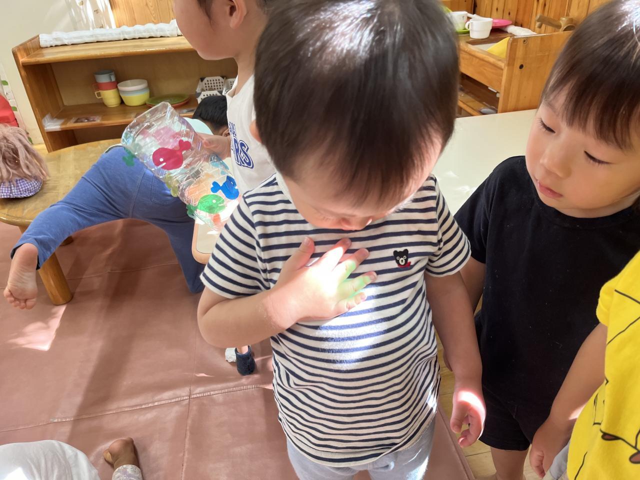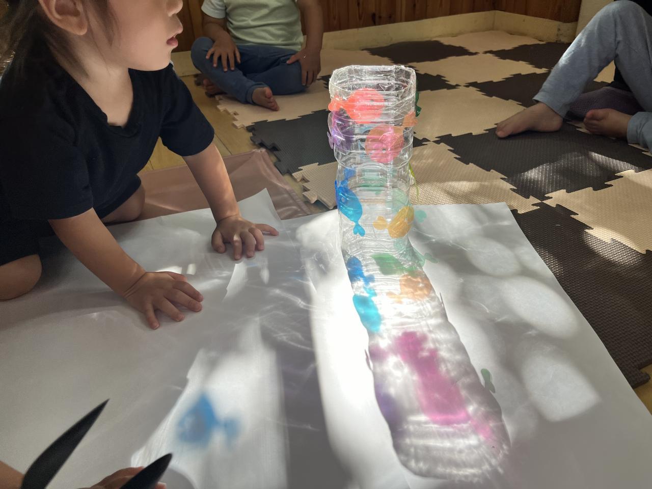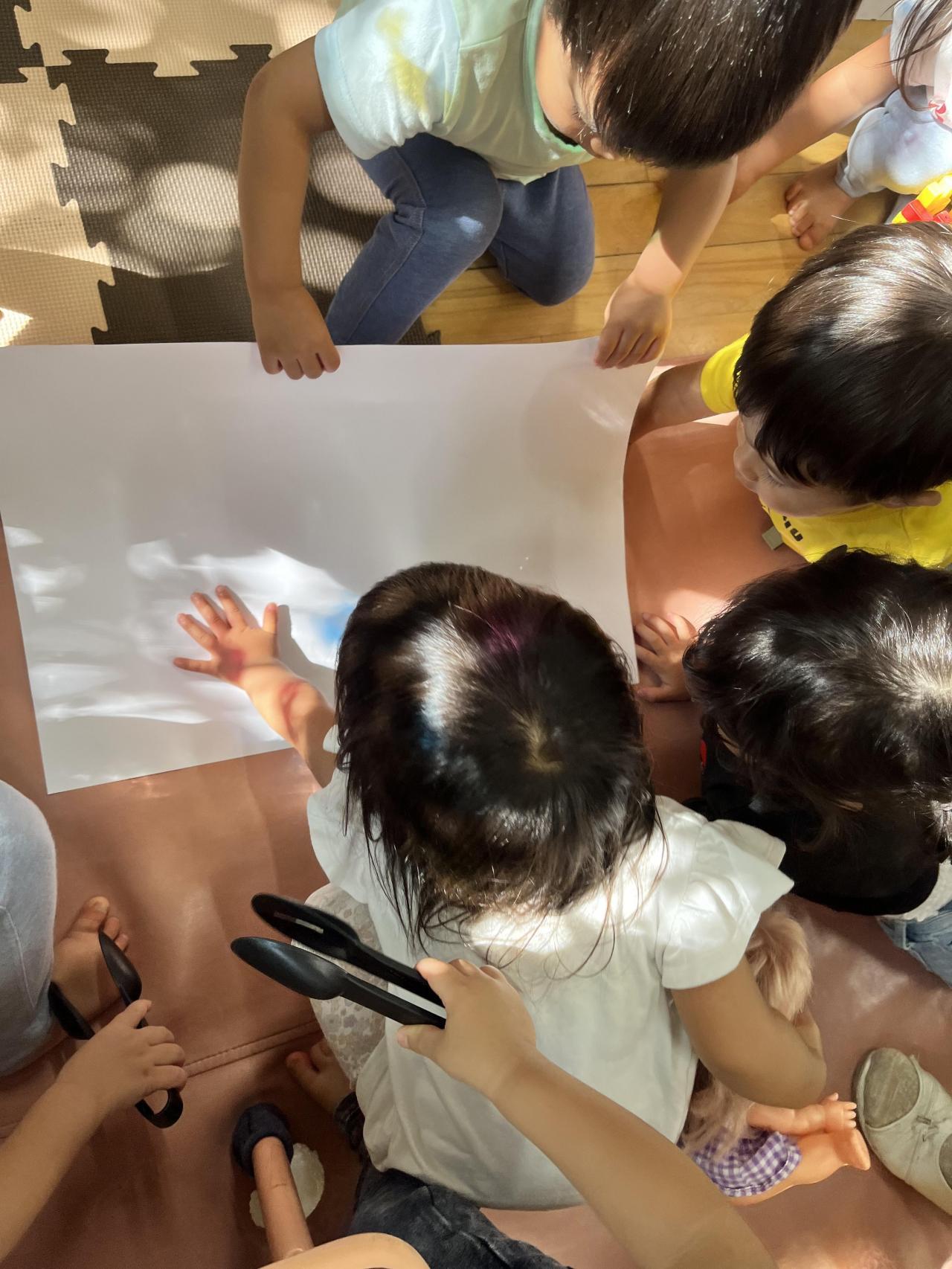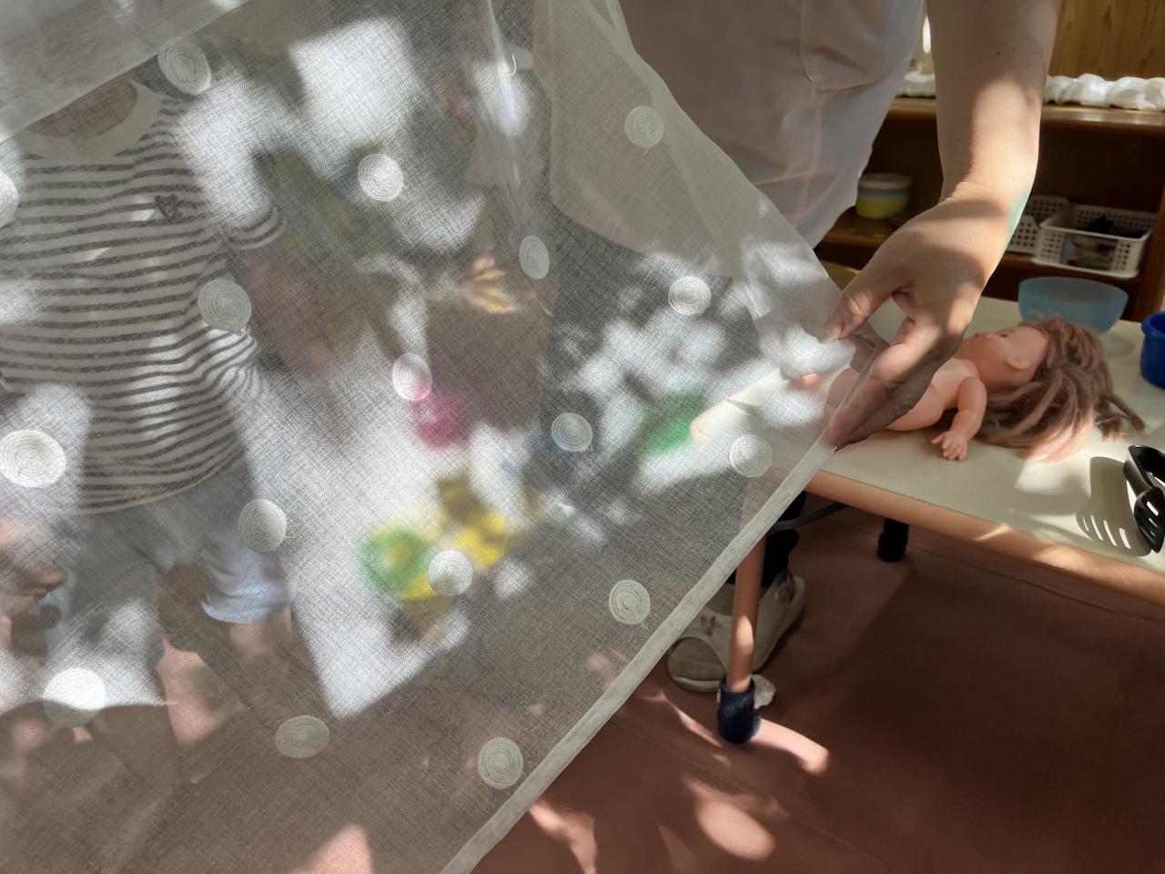 昨日の午後、保育室に差し込んだやわらかな日の光を使って「きんぎょがにげた」の光と影を使った遊びを継続して楽しみました♪