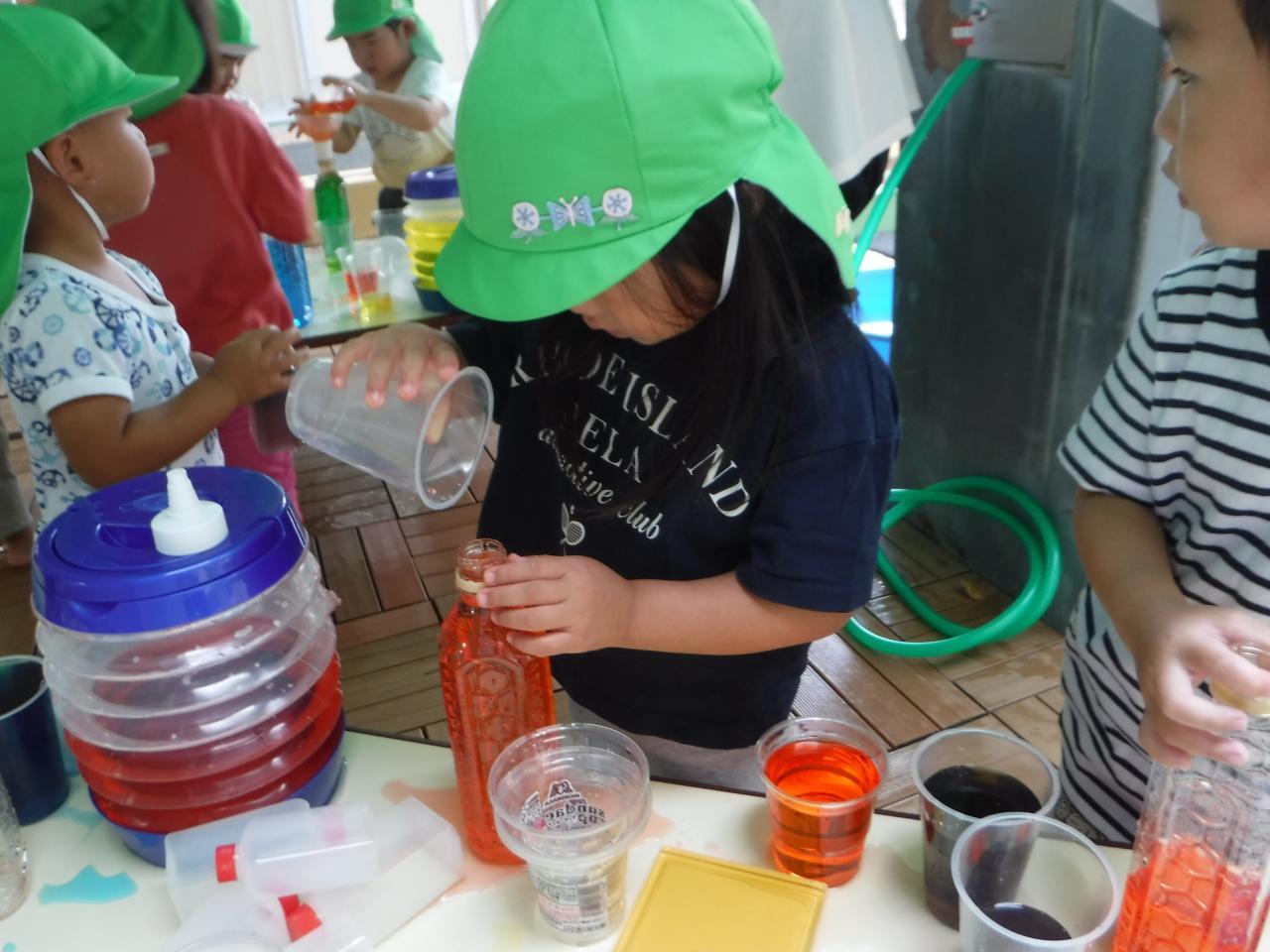「あおいろちょうだい」「いいよ」などと友達同士で言葉を交わし、それぞれの色の色水を分け合いながら、自分だけのオリジナルジュース作りを楽しんでいました