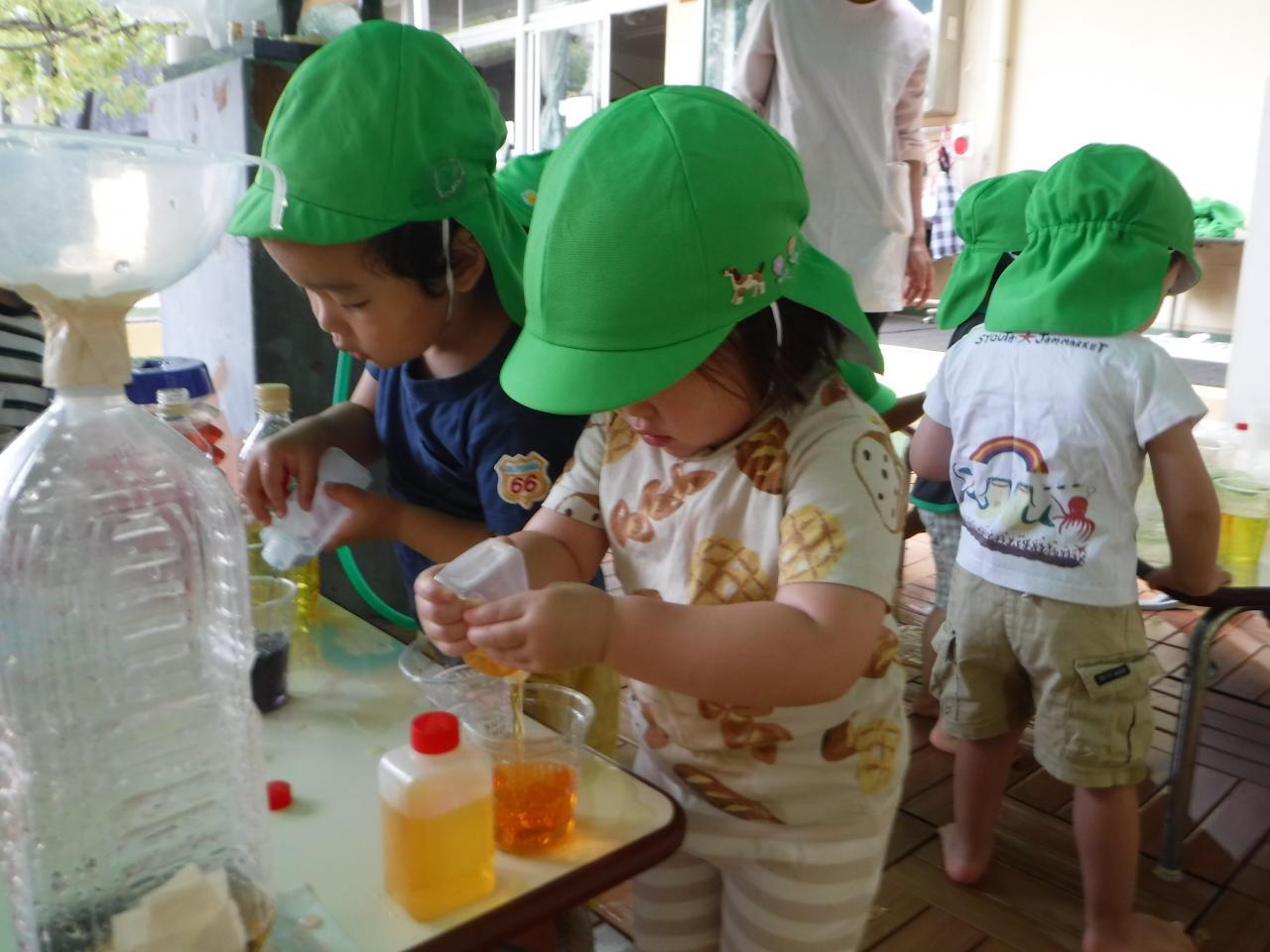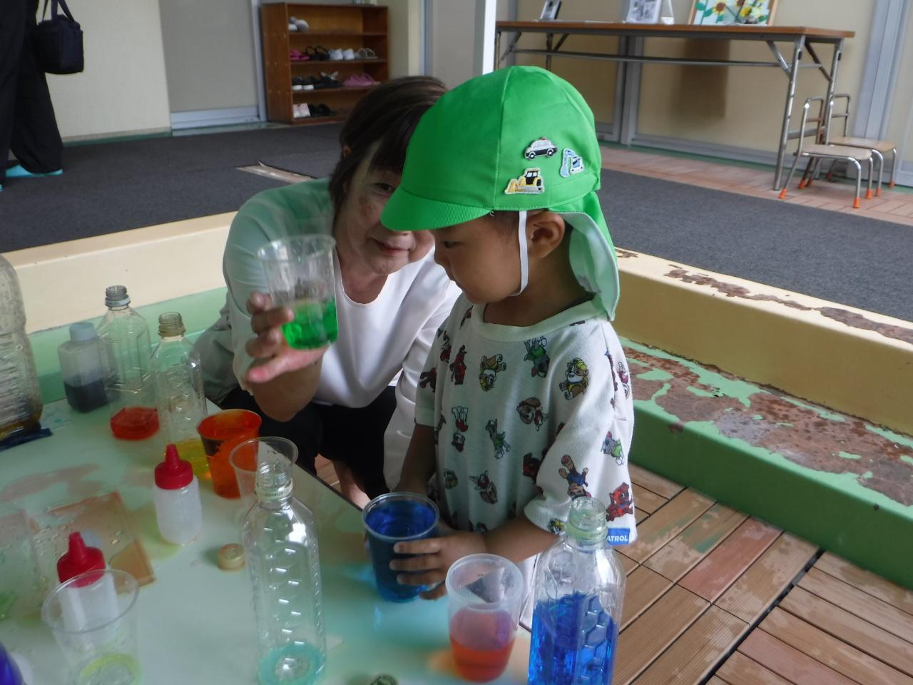 色水遊びを通して、色水を混ぜる際に水の配分によって色が濃くなったり薄くなることに気づくなどの発見がありましたよ