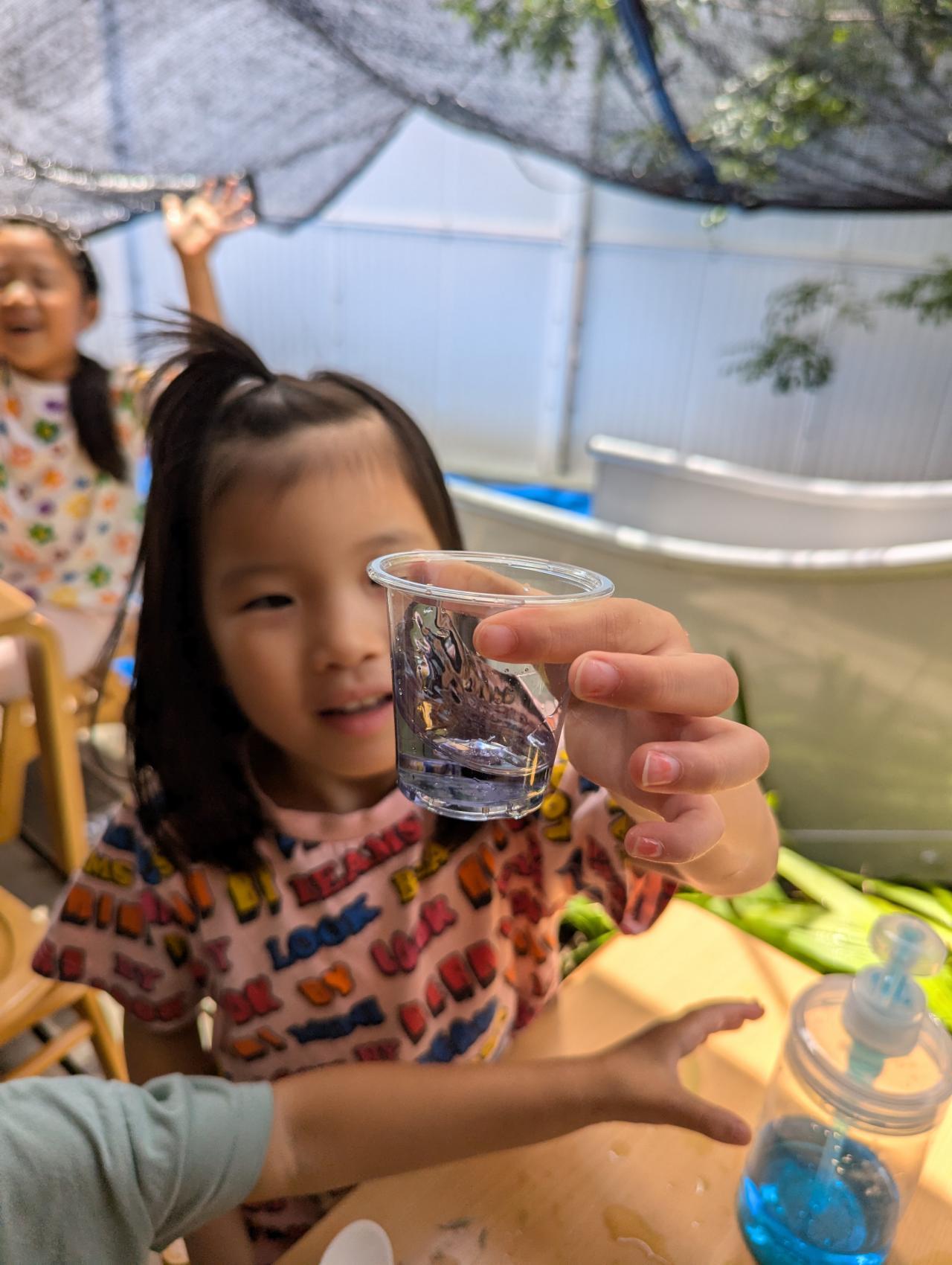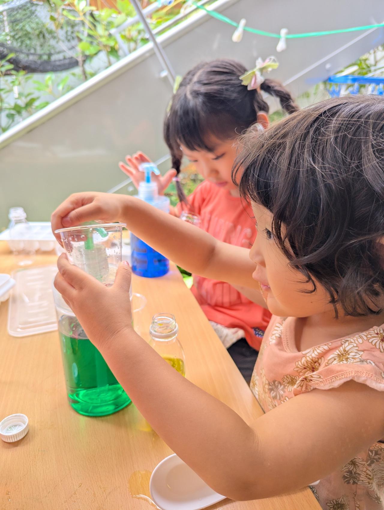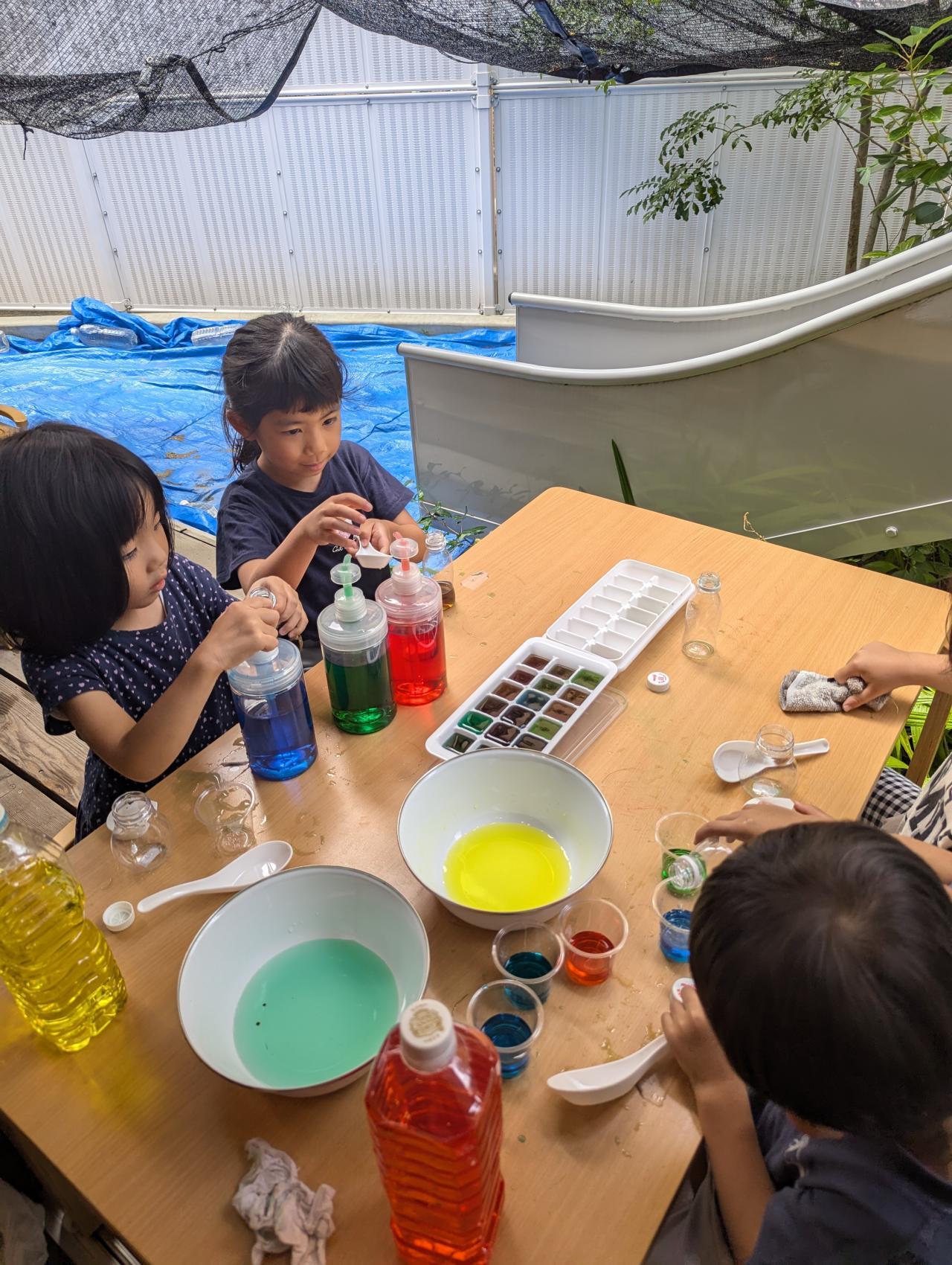 色を混ぜてどんどん変化することで、新しい色を作り発見することが出来たり、「好きな色作ろう」と言って自分の好きな色を見付けたりする姿も見られました。