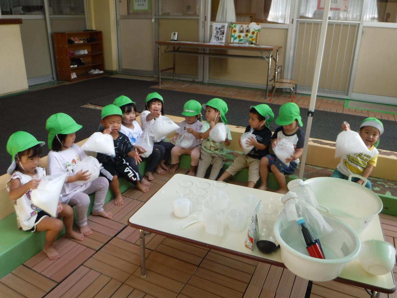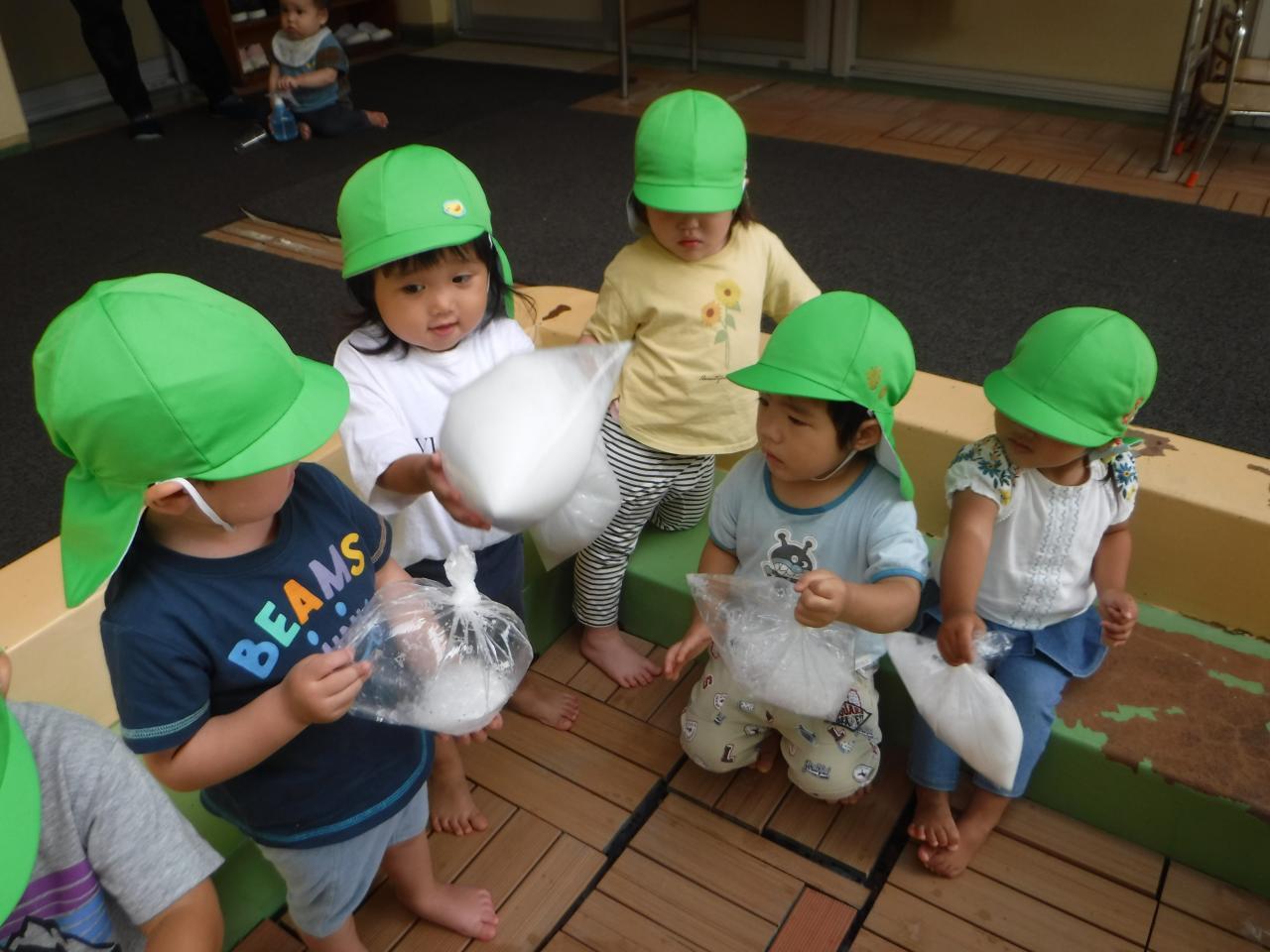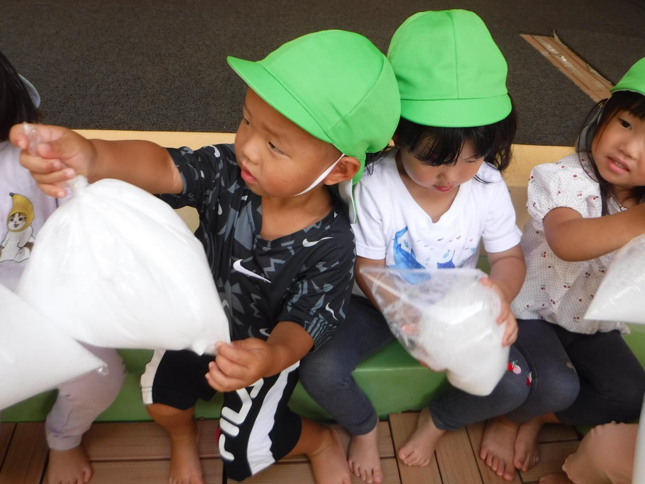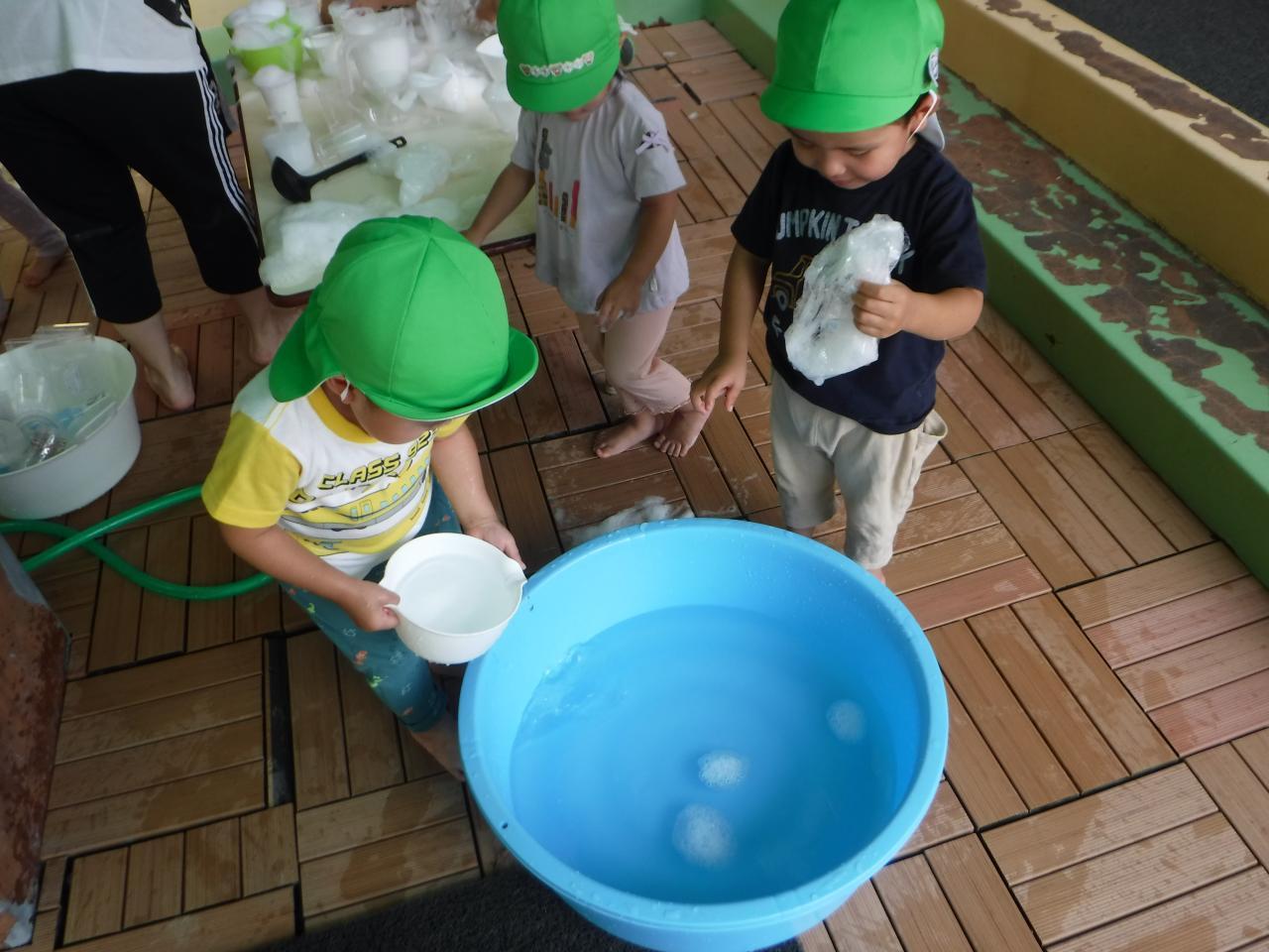 「わぁ!(あわが)うかんでるよ!」「フワフワうかんでる!」「クラゲみたいだね!」といった声が子ども達のなかからあがりましたよ!