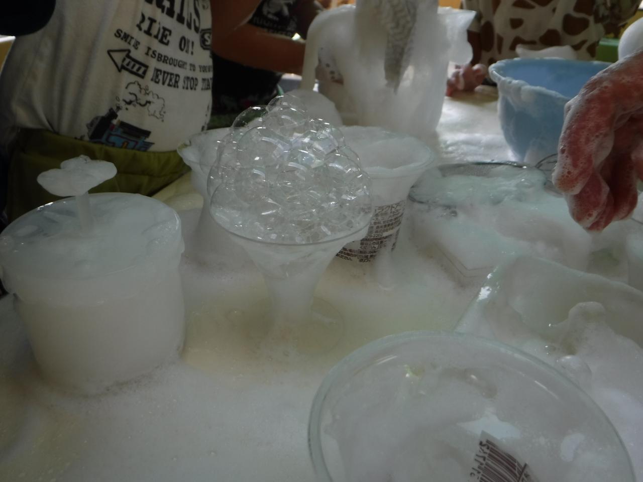 「泡を水に浮かべたらどうなるんだろう?」と、子ども達自身が疑問をもち実際に水に泡を浮かべることで、新たな発見につながりました