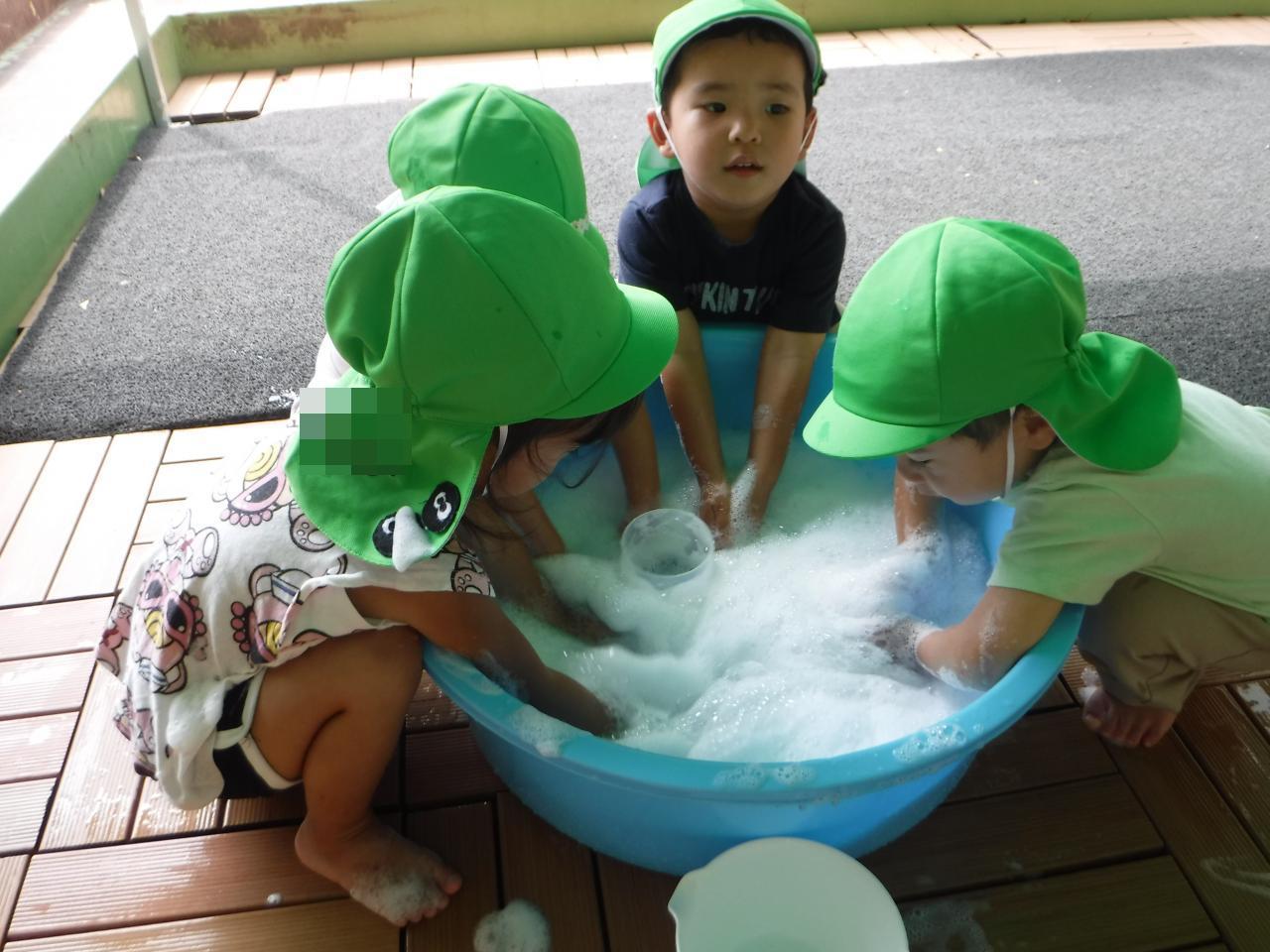 ○石鹸を泡立てたり、息を吹きかけたりしながら泡の感触を楽しんでいましたよ!