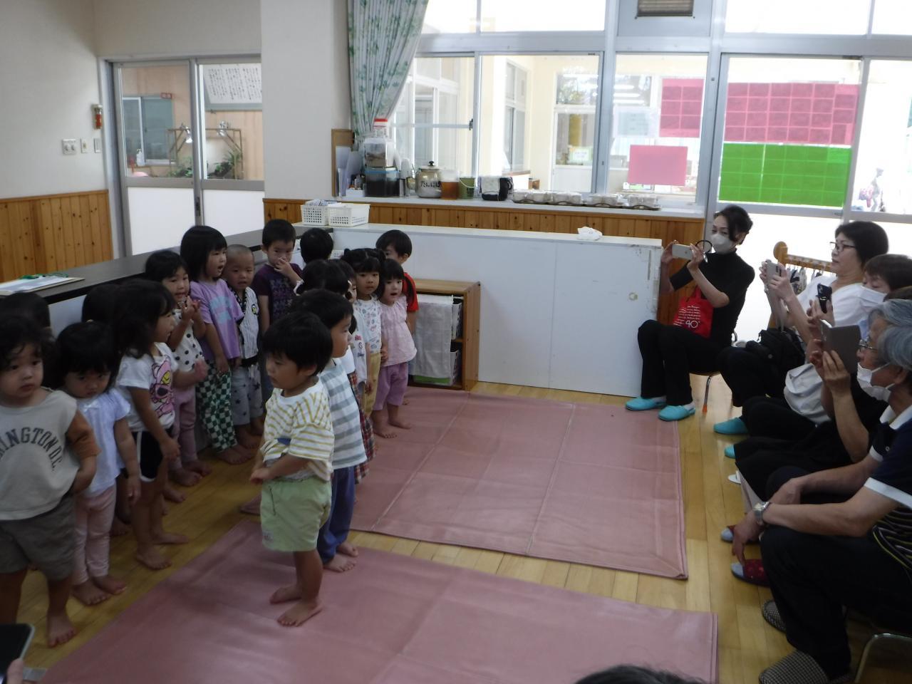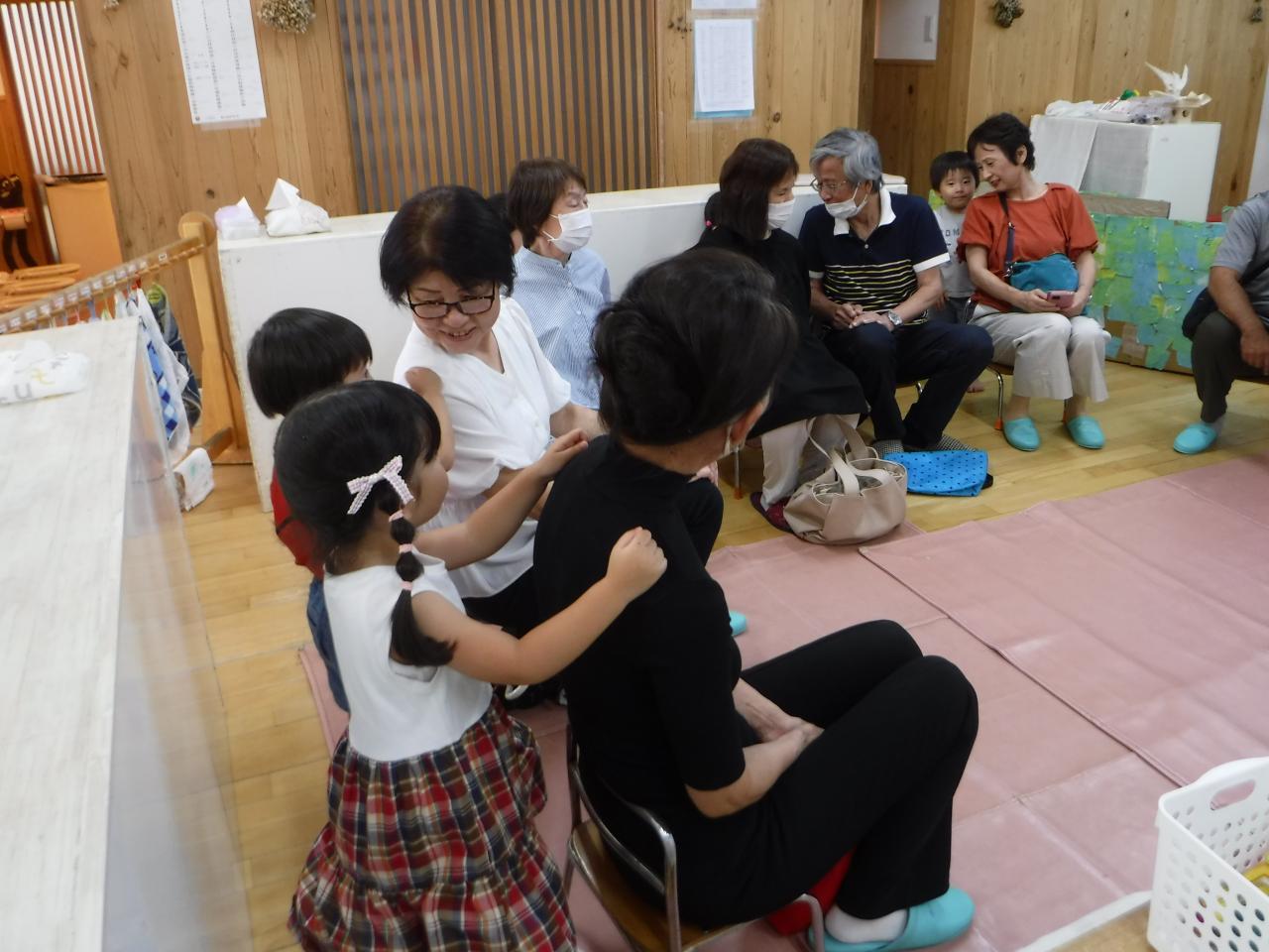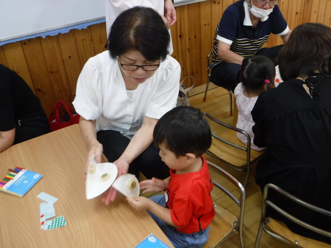 最後に「とんぼのめがね」の歌に合わせて、おじいちゃんたちと一緒にカスタネットを演奏し、手作りのカスタネットが奏でる音色を楽しんでいました