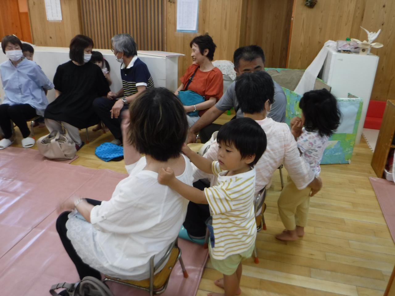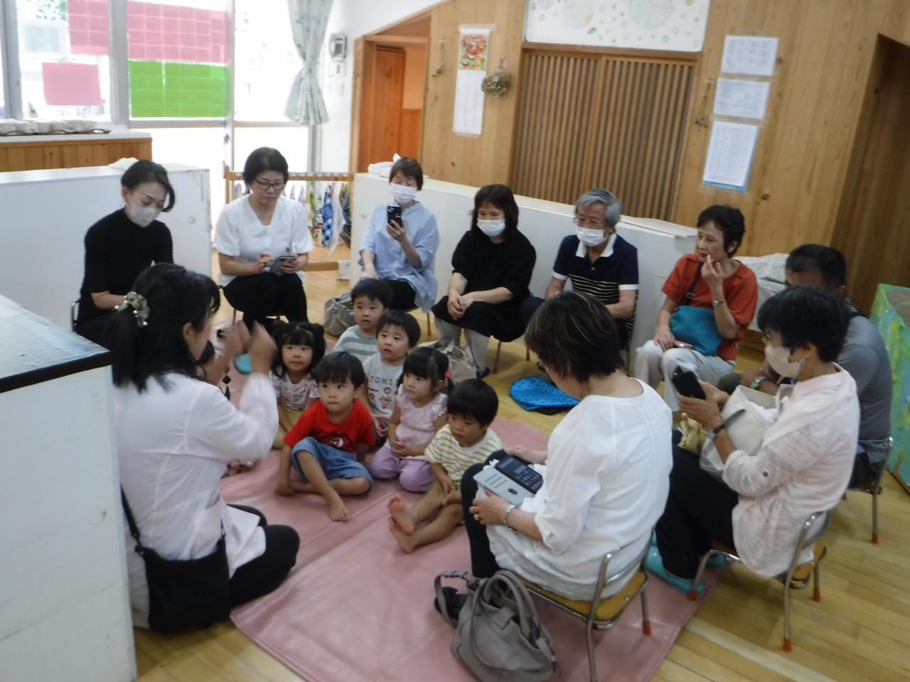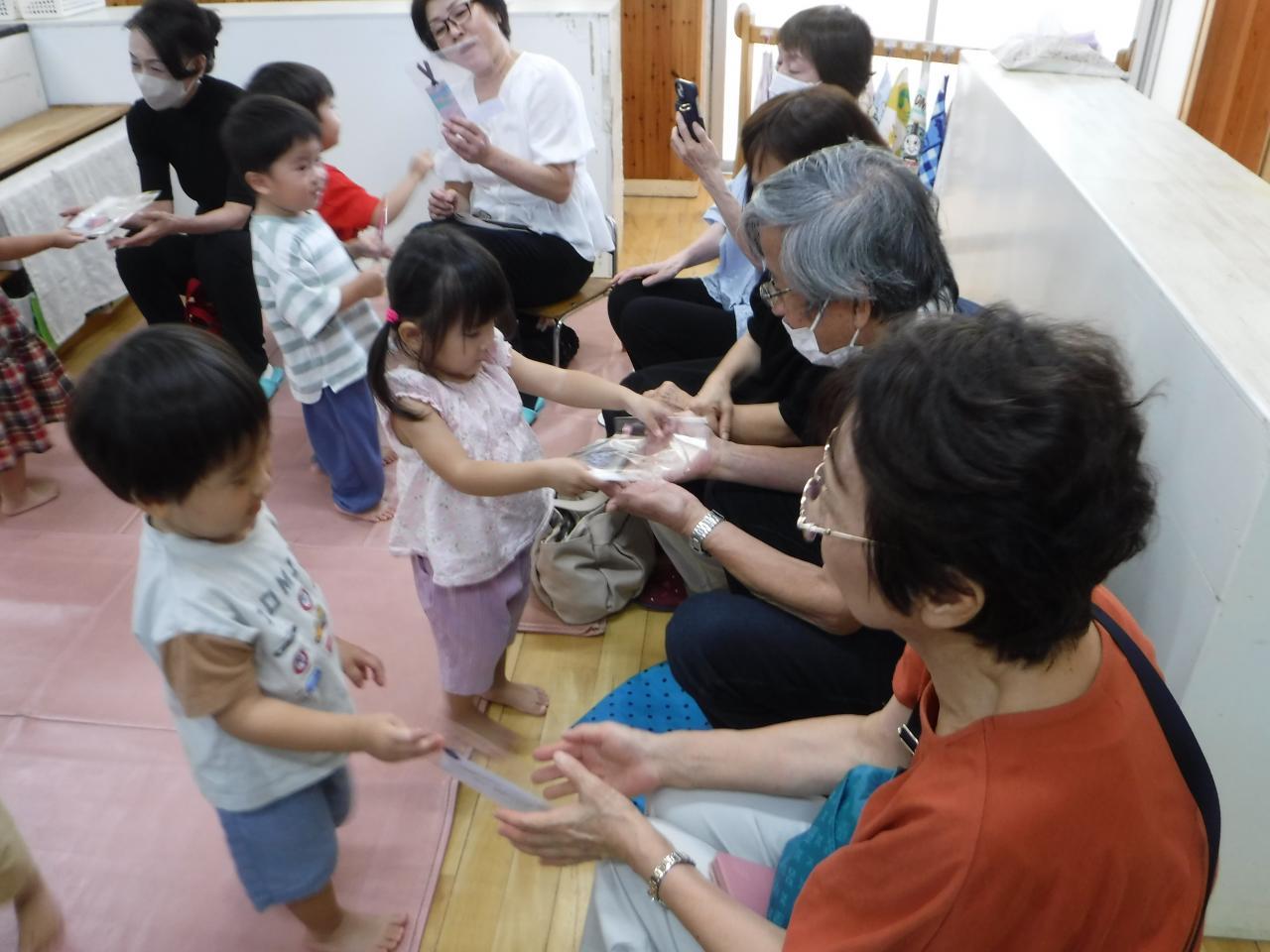 最後に「とんぼのめがね」の歌に合わせて、おじいちゃんたちと一緒にカスタネットを演奏し、手作りのカスタネットが奏でる音色を楽しんでいました