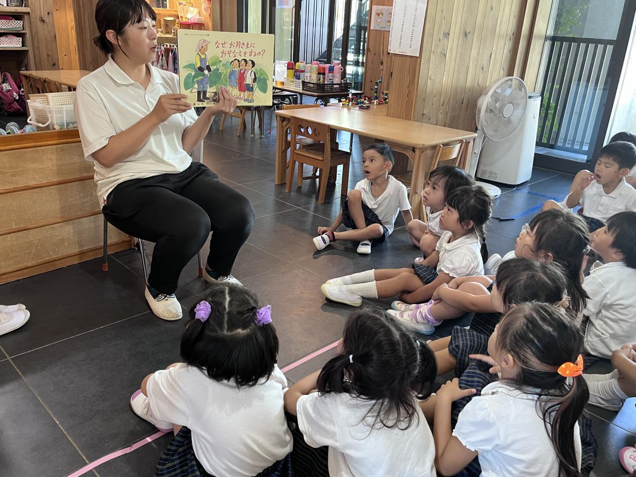 お月見の由来を話したり、絵本や紙芝居を読みました。