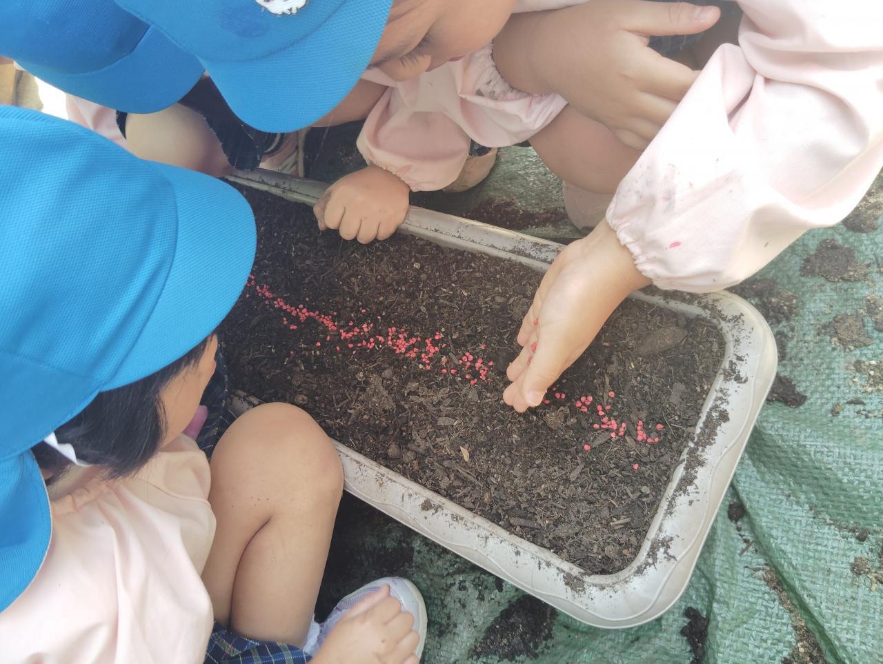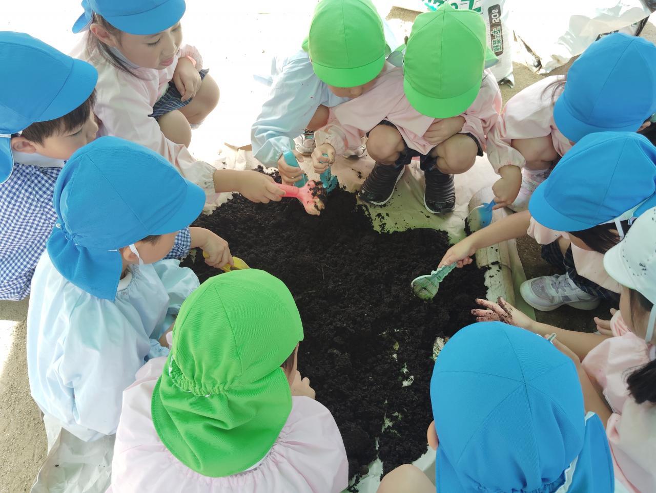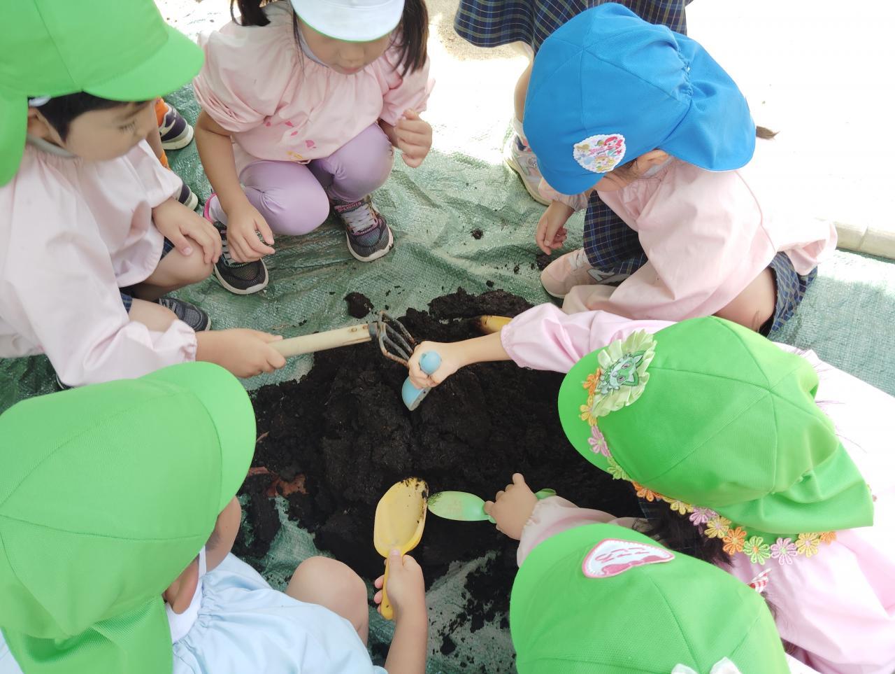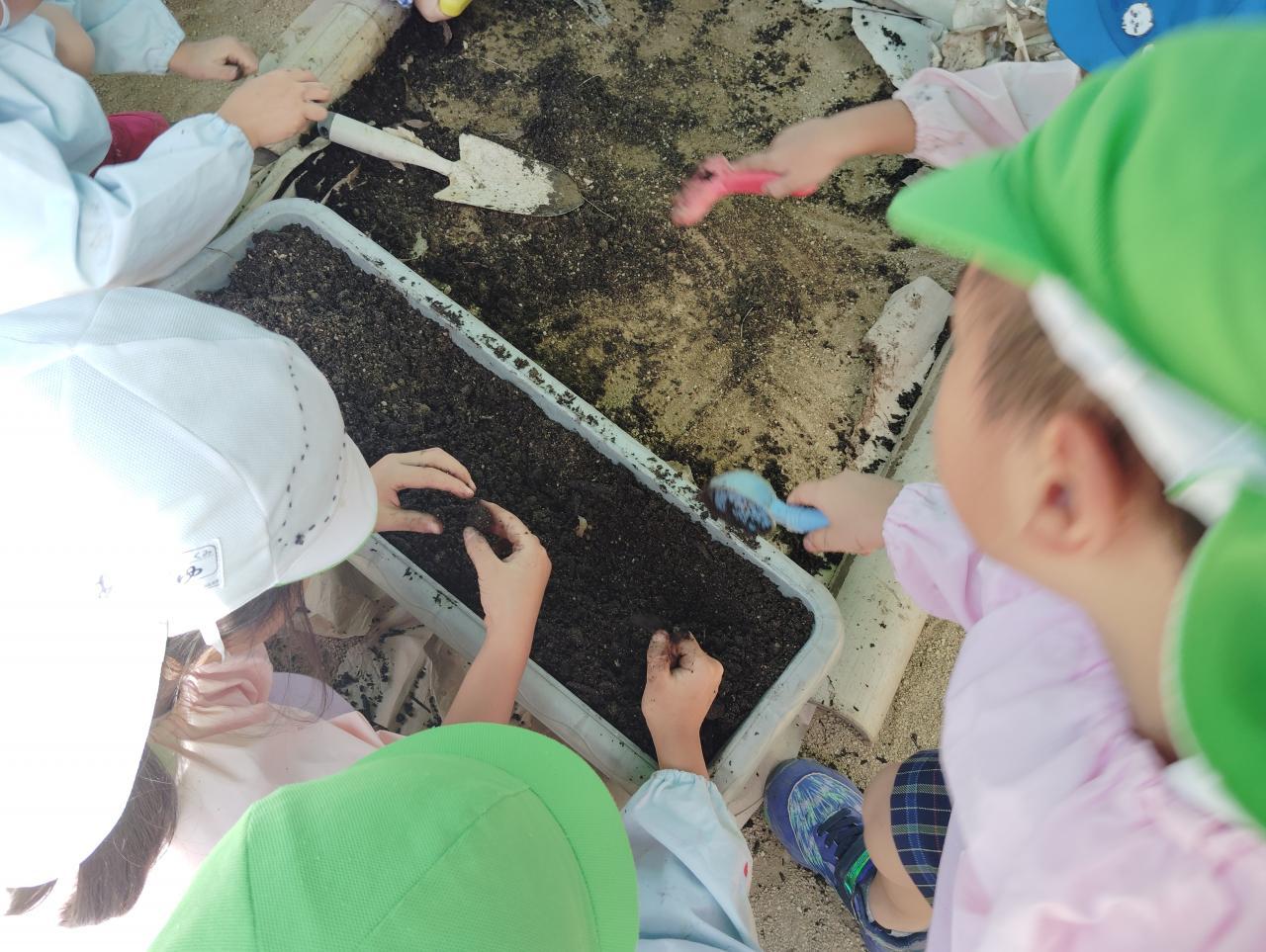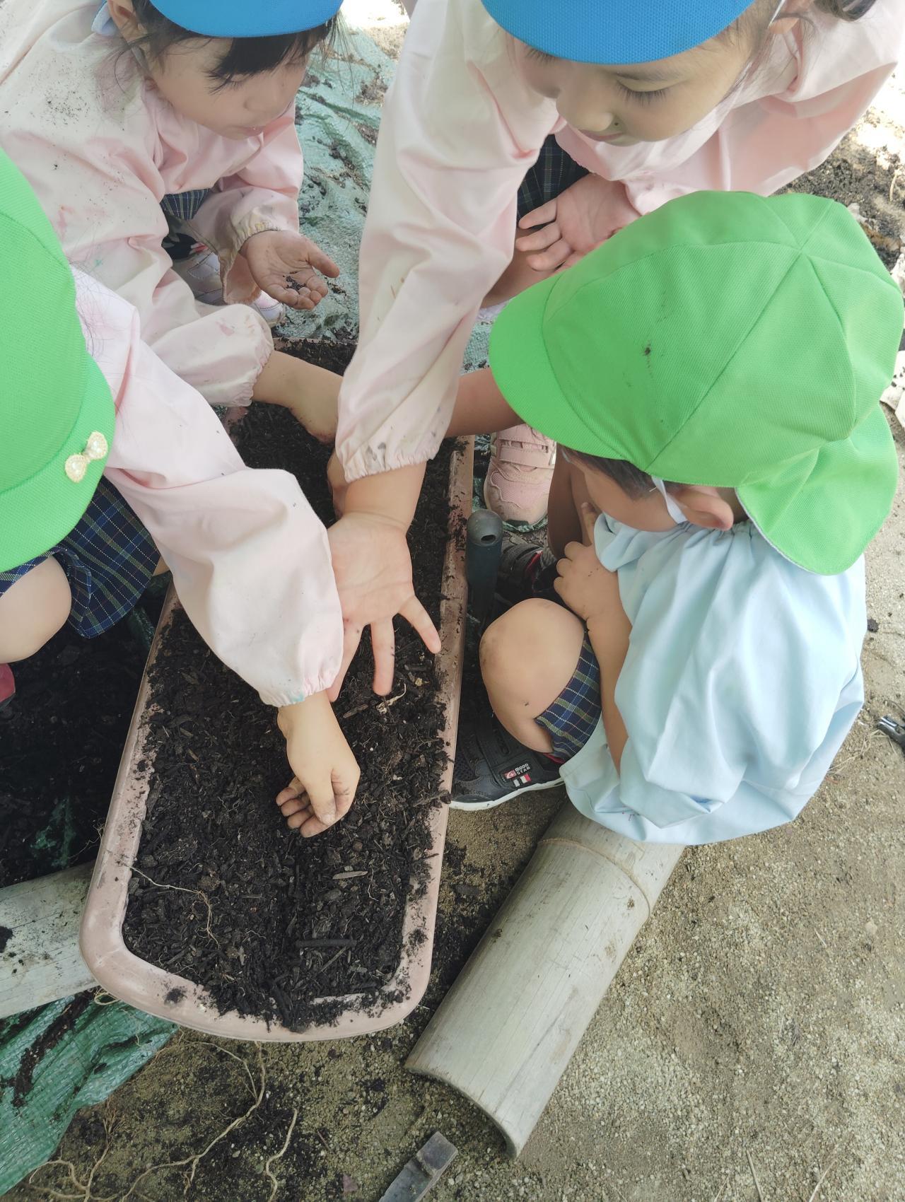 〇土のプロジェクトでは様々な、土を触り、違いを知ったりすることが出来ました。今日は、土の中に、幼虫やミミズがいて、「あっ虫がいてる土は健康な土だよね~」と今までの経験で子どもたちなりに感じている様子でした。