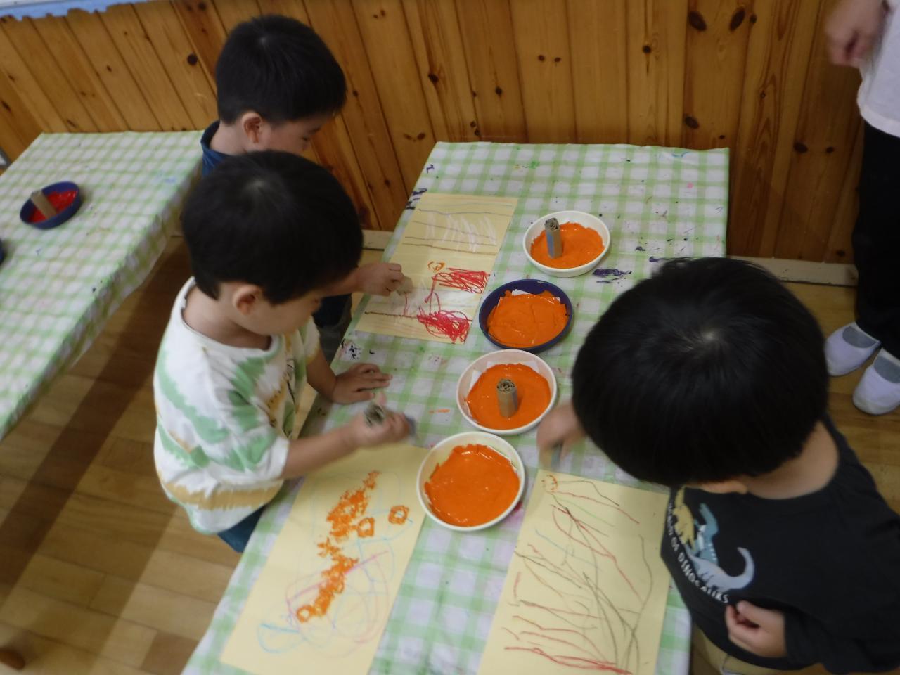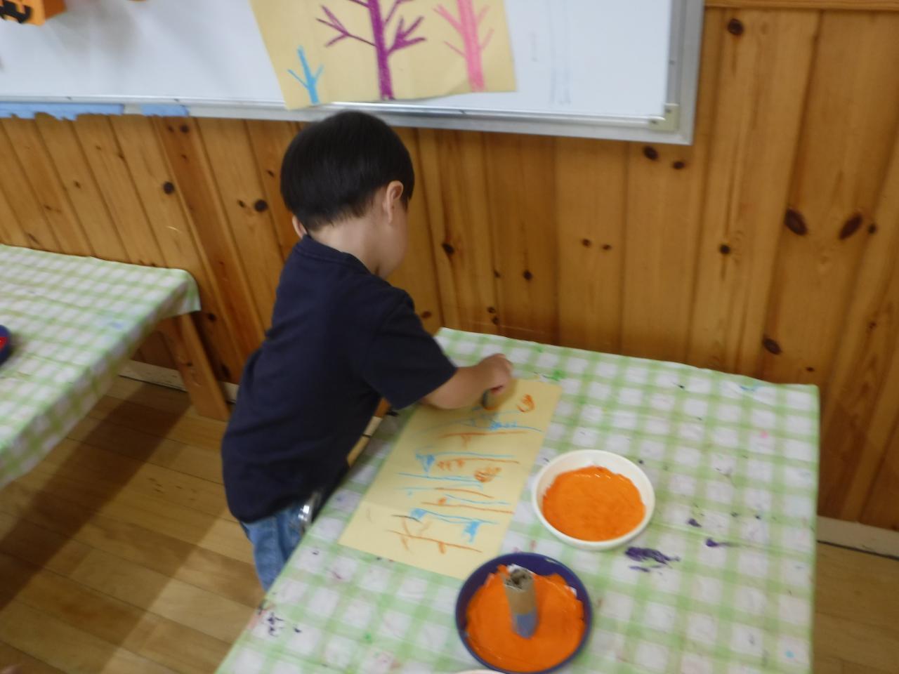 実際に見てきた木を思い出しながら、色づいた葉の様子を廃材を使ったスタンプを使って表現しました