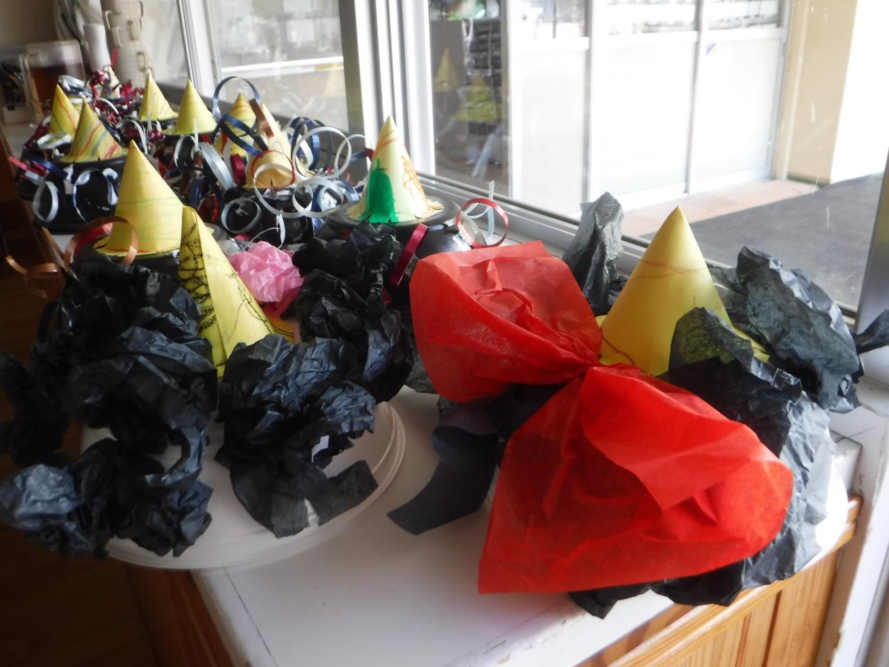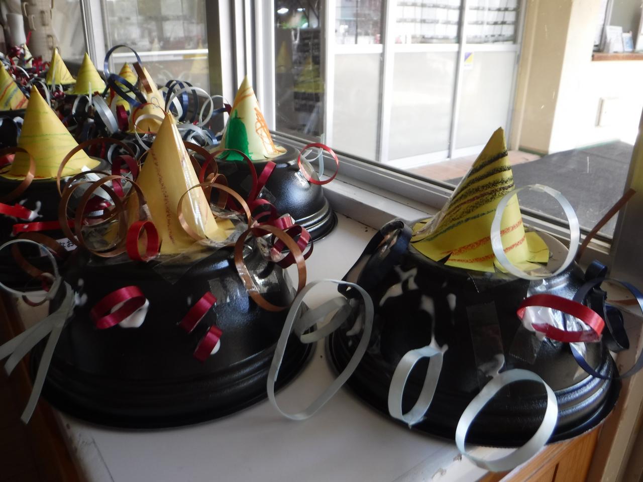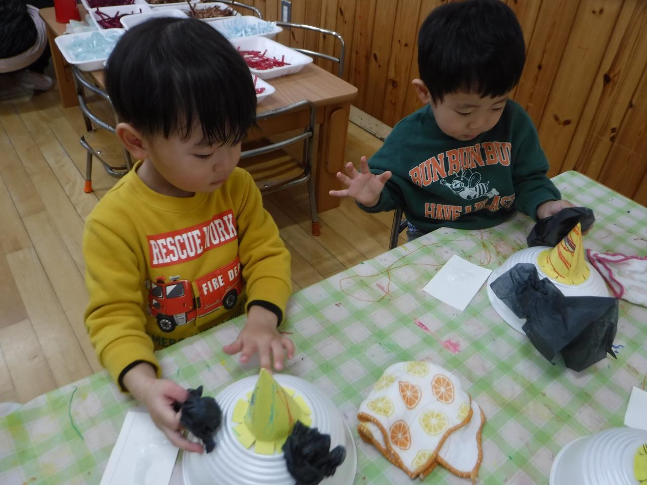 オニのかわいい帽子が完成すると、友だちと帽子を見せ合いながら