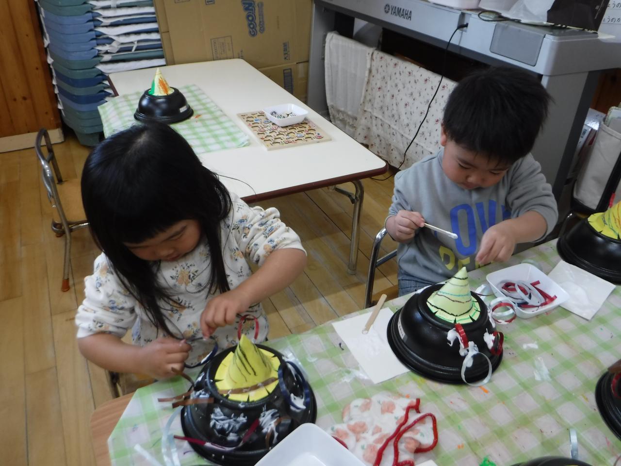 今日は節分の制作で、オニの帽子を作りました