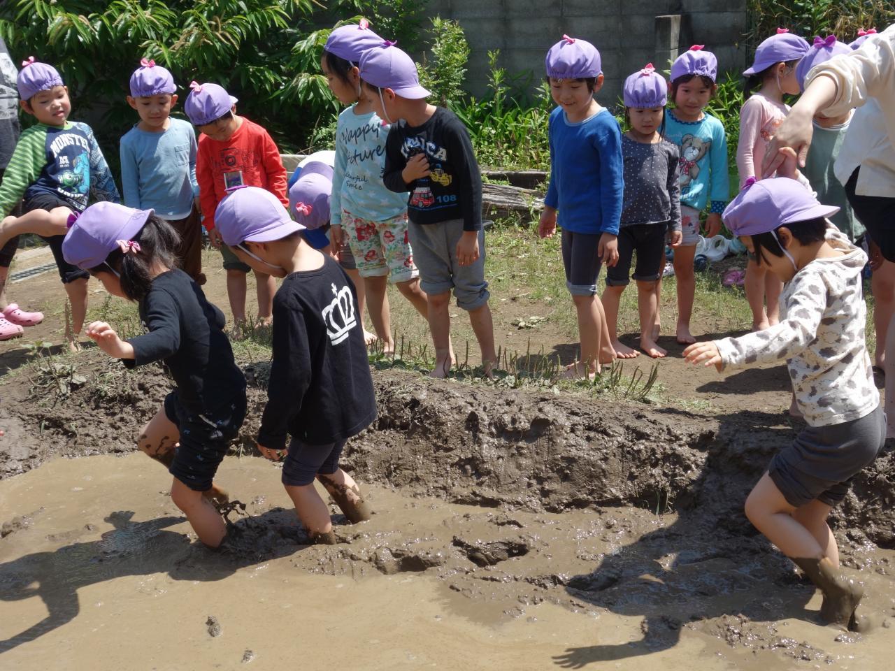 その前にドロドロになった田んぼの中を歩き、足慣らし!「きりん組の時、あそんだな」「そっと歩かないとこけてしまうー」など声があがり、きりん組の時に行った、田土遊びを覚えている子どもも沢山いました。