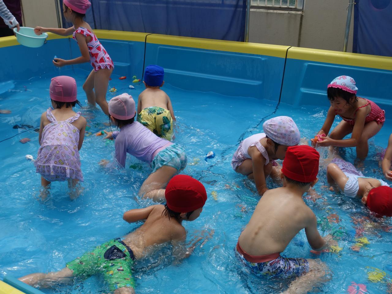 プール活動の日は朝からワクワクな様子の子どもたち。顔をつけるのが苦手だった子どもは、遊びを通して平気になり「水に顔つけれるで!」と自信がついてきました。ワニ歩きや水かけ競争など、楽しく過ごしていますよ。