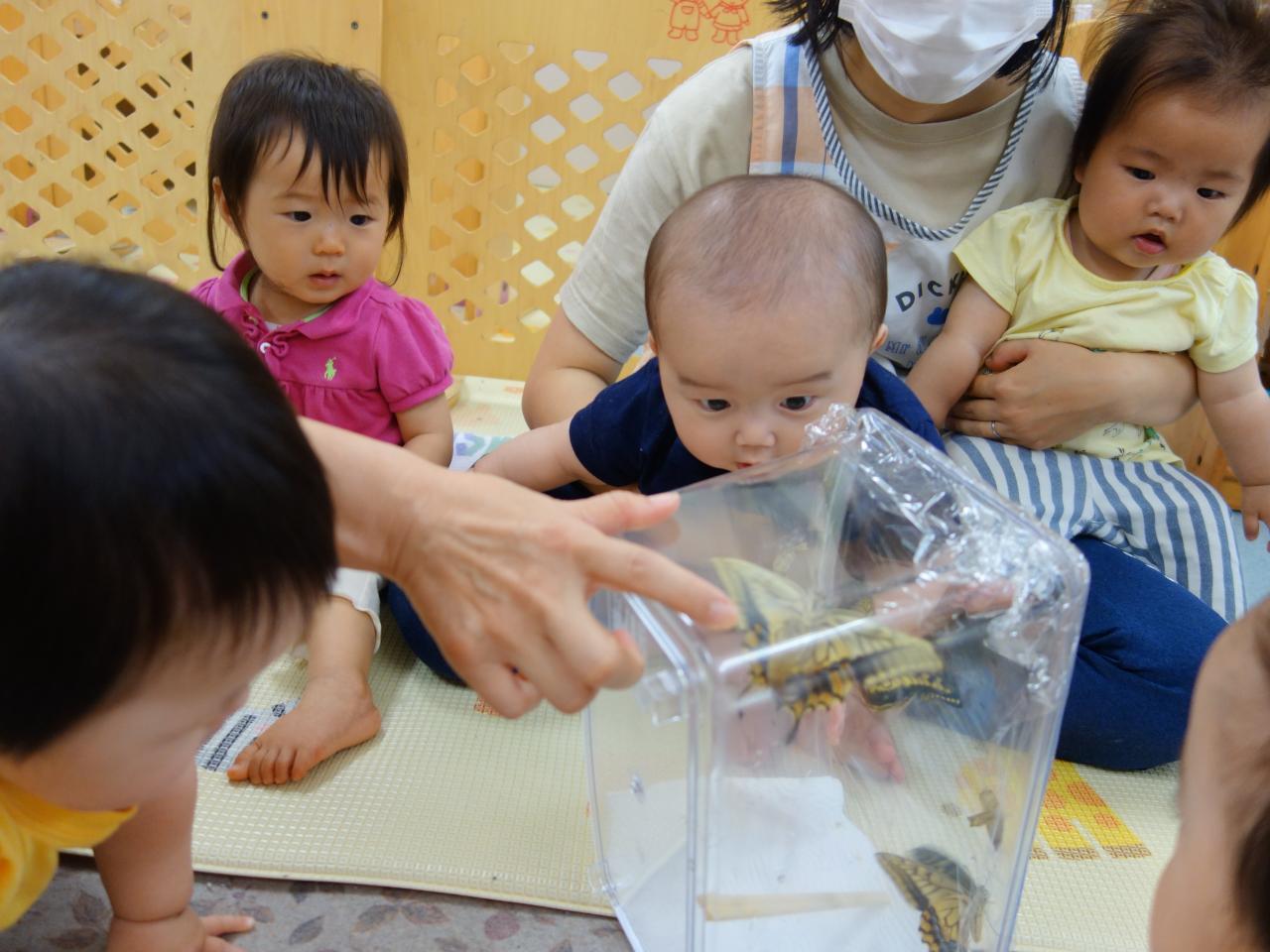 保育室で幼虫の頃からエサをやったり、お掃除をしたりして成長を見てきたアゲハが成虫になりました。幼虫とは全く違う姿に変わりパタパタと羽をはばたかせる姿に「これはなんだ?」という様子で興味深く眺めていました。