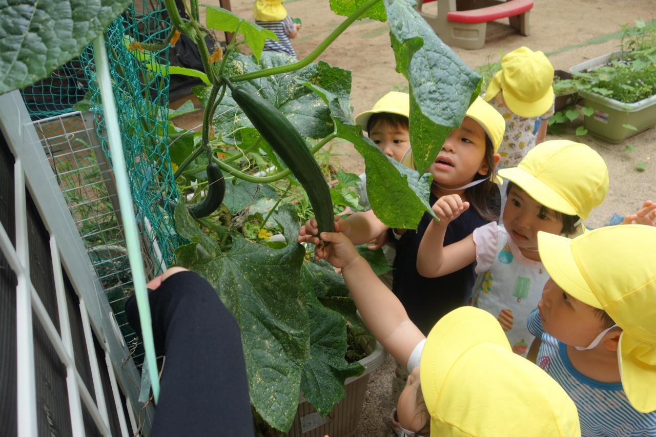 苗から大切に育てていたキュウリが立派に育ちました。「大きいね」「葉っぱがチクチクするね」など話が弾む中で収穫を行いました。ランチの時にいただきましたが、自分たちで育てたキュウリは普段苦手な子も「食べてみよう!」と挑戦する姿もみられました。きっと、おいしかったでしょうね!