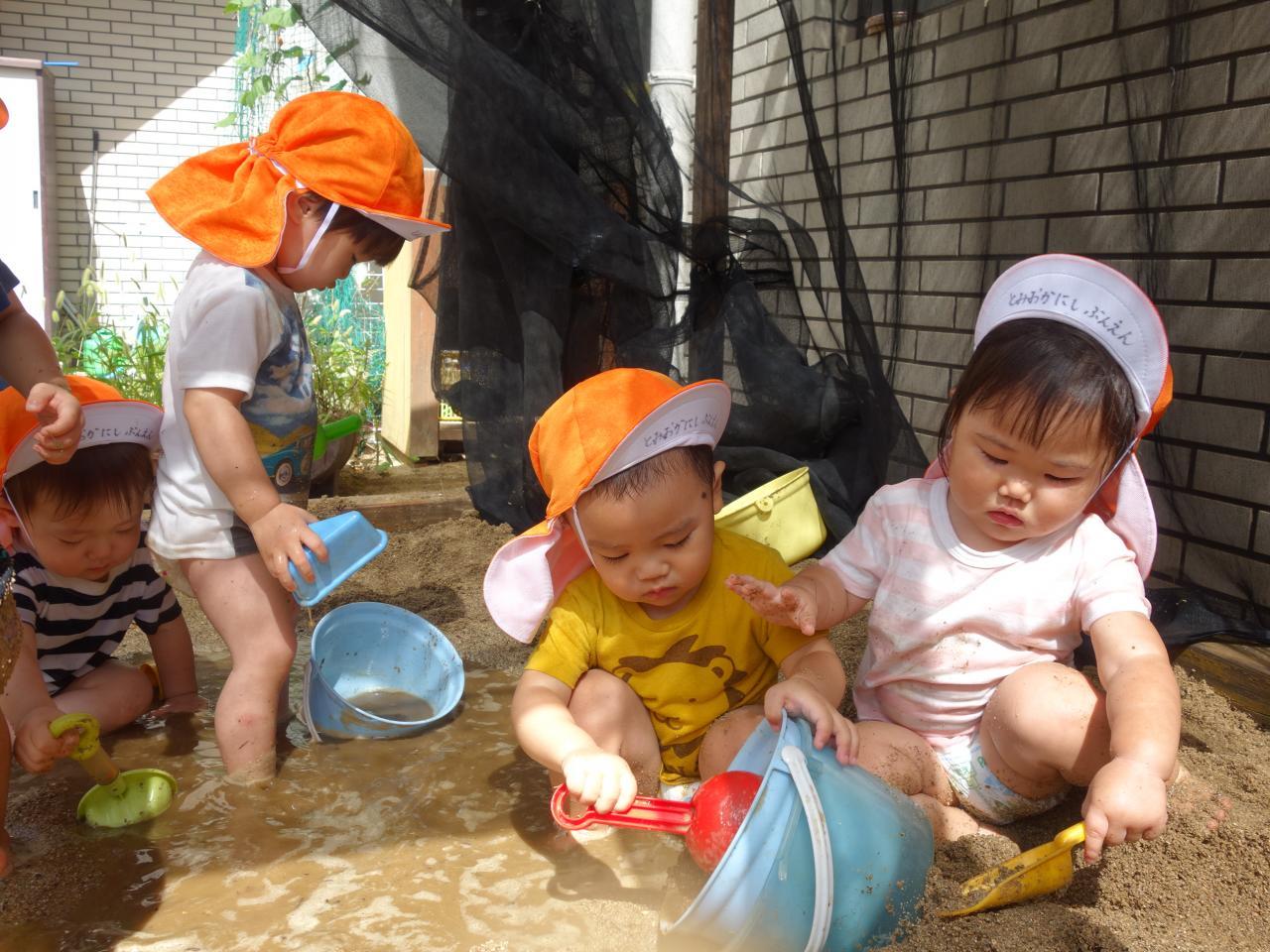どろんこ遊びを行いました。泥水の中に手足を入れ、感触を味わったり、バケツの水を出し入れしながら音を楽しんだりしています。顔に少しくらい泥がついてもへっちゃらです。たくましいですね。🌞