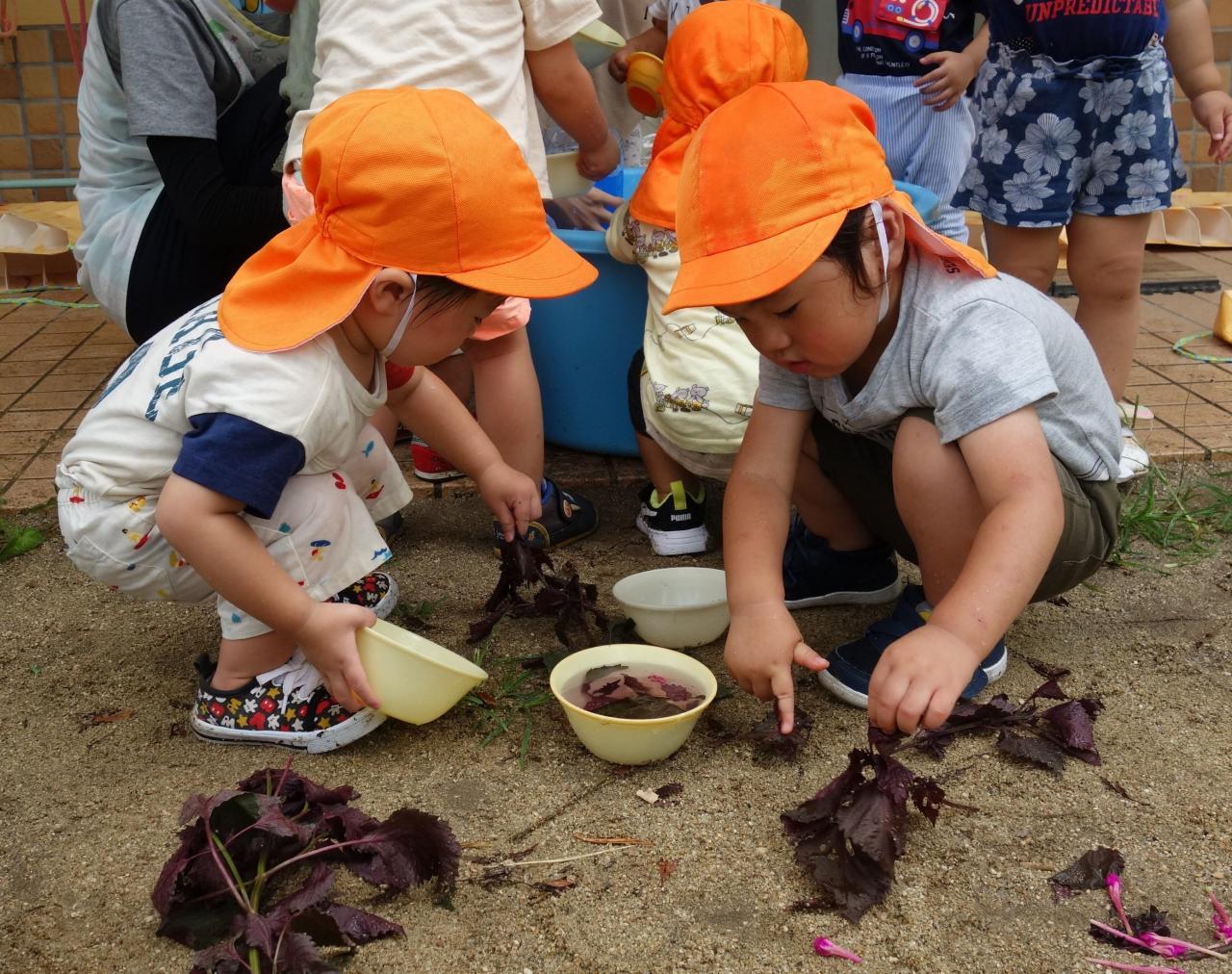 菜園で育てた赤しそと園庭に咲いているオシロイバナを使って、色水あそびを行いました。手でにぎったり、ちぎったりして匂いを嗅ぎ、水につけて薄い紫色にかわる様子をみて「わぁ」😀と驚いたりしていましたよ。