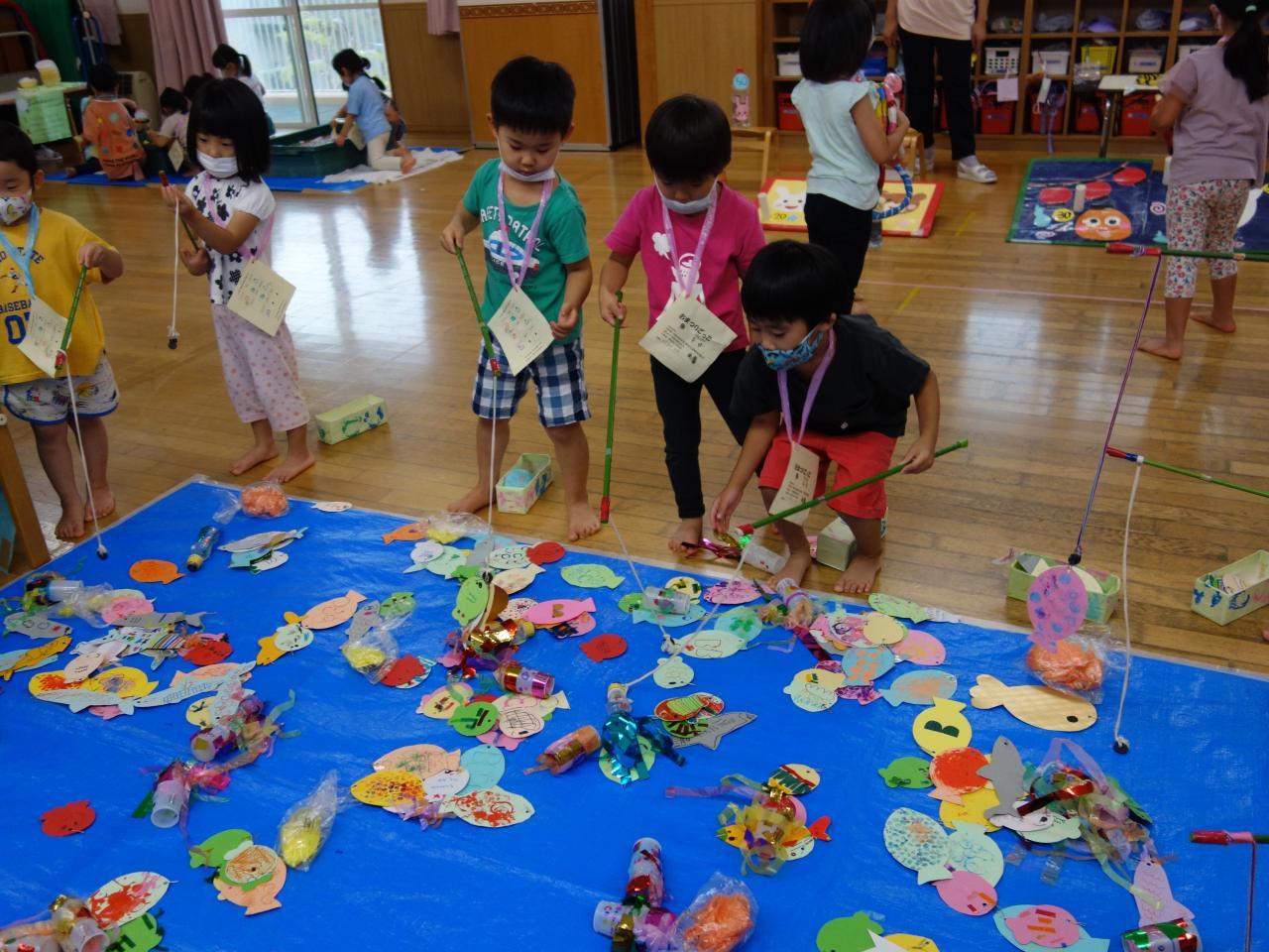 おまつりごっこに参加しました。魚釣り・スーパーボールすくい・わなげ・手作りヨーヨーのコーナーを順に回り楽しみましたよ。キラキラ✨の魚を釣ると「やった!キラキラゲット!」と大喜びでした。