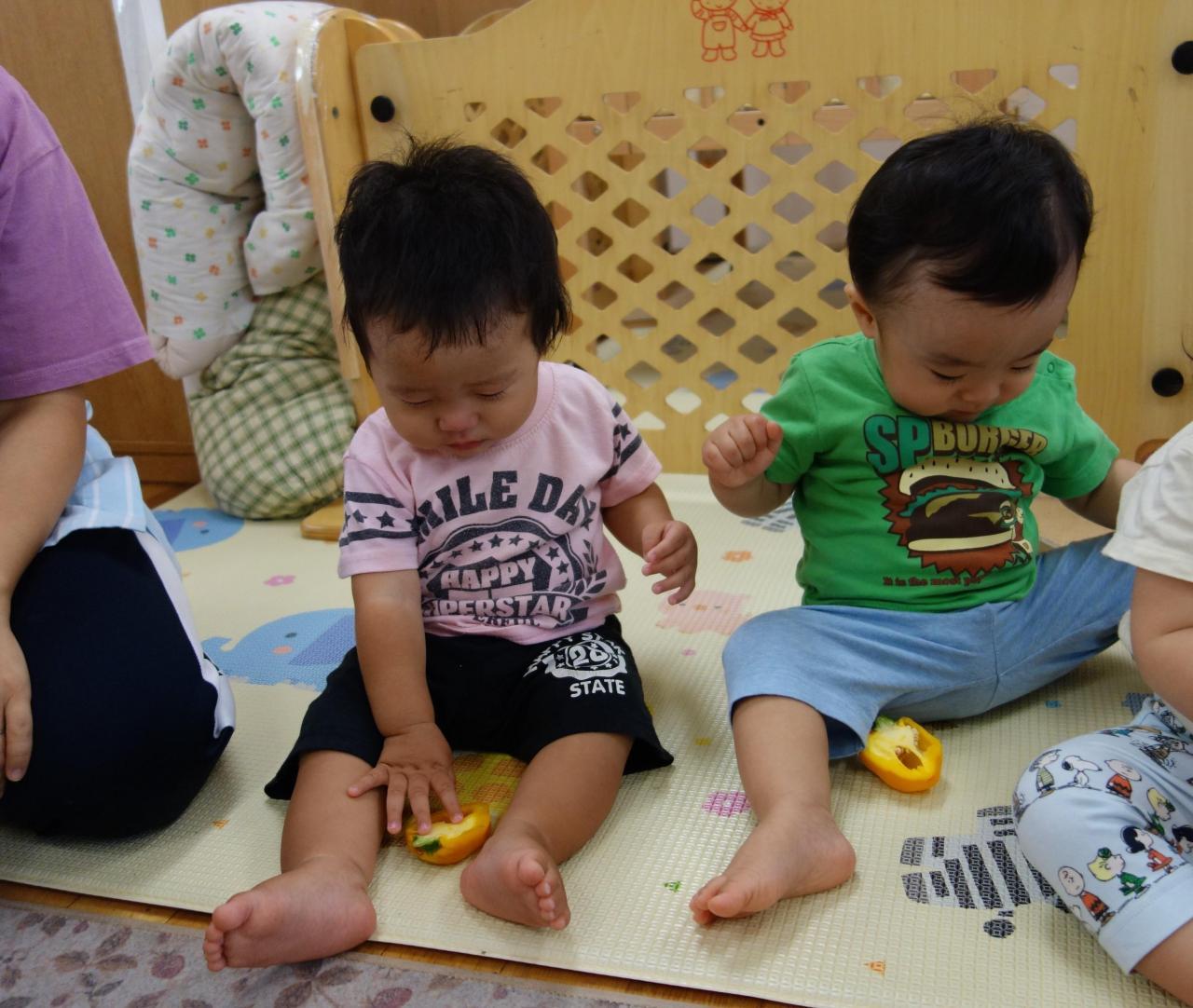 クラスで世話をしていたパプリカを収穫して、匂いを嗅いだり、半分に切った断面や中の様子を見たりしました。初めは緑色だったパプリカも日ごとに黄色になり、色の変化が見られました。子どもたちには、まだまだ難しいかと思いますが・・😄また来年も観察できたらと思います。