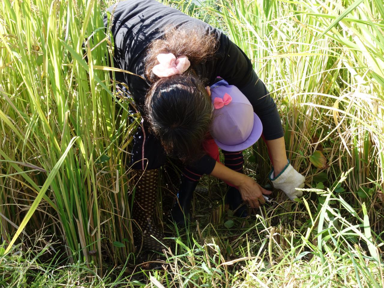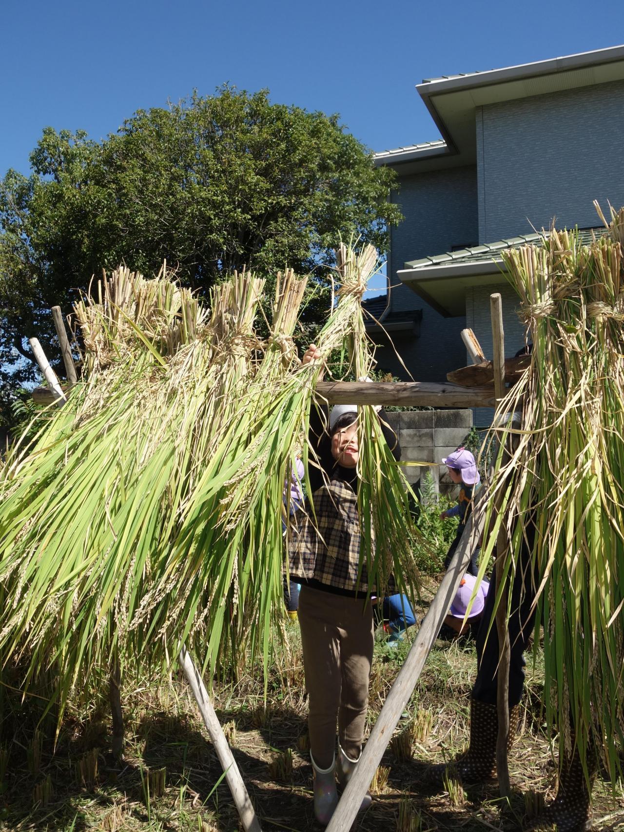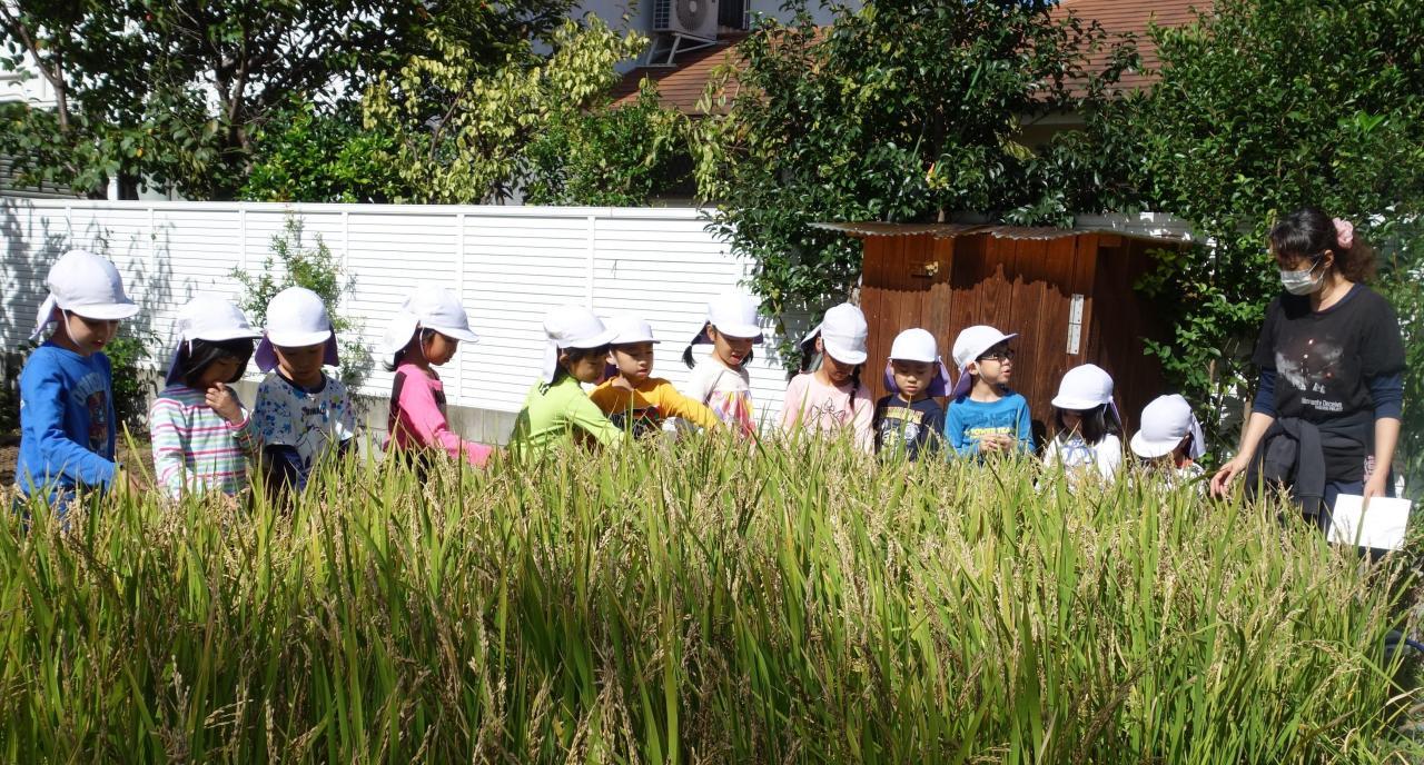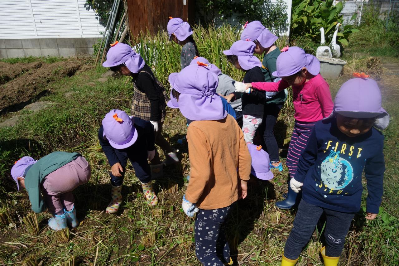 5歳児クラスが春から生長を見守っていた稲🌾を刈りました。まずは、もみの中に米がつまっているか手で触って確認し、「あ、中が詰まってる」「これは空っぽや」と声があがっていました。先生から鎌の使い方を聞いて、保育者と一緒に稲刈り体験!ザクザクという刈る感触を味わいながら楽しそうでした。刈り取りが終わった後は、田んぼの中に入って生き物探しも行いました。「うわ!小さなアマガエルがおる」「バッタやバッタ!」と大喜びでした。刈り取った稲のコメが甘くなるように、逆さにして干す、はざかけも行いました。「あまーくなーれ」とみんなでお願いの魔法をかけて稲刈りは終了。11月の脱穀も今から楽しみにしている子どもたちです。