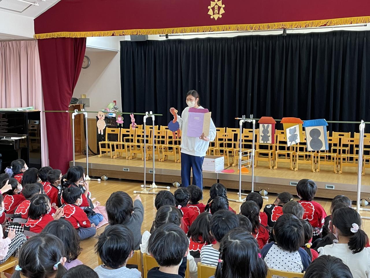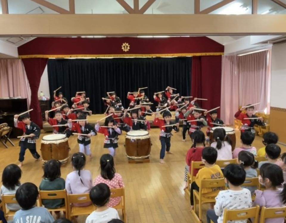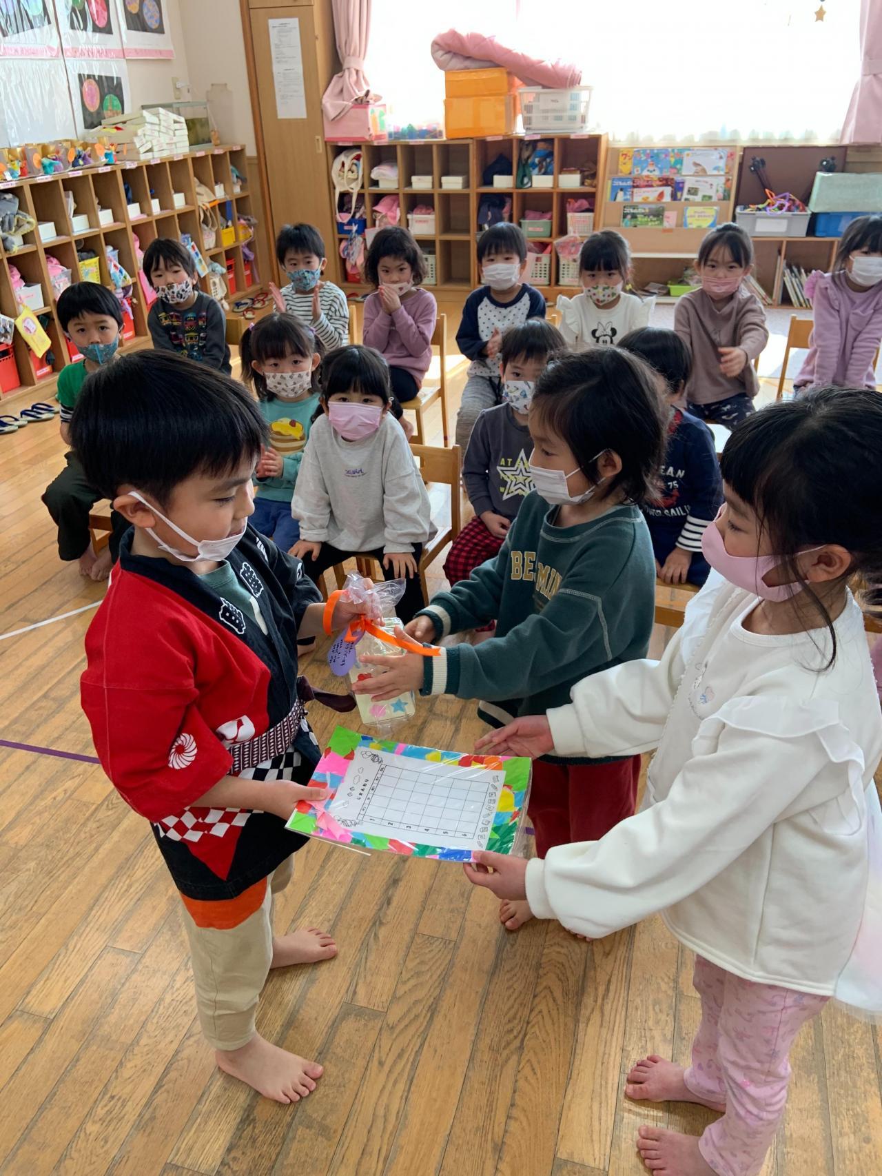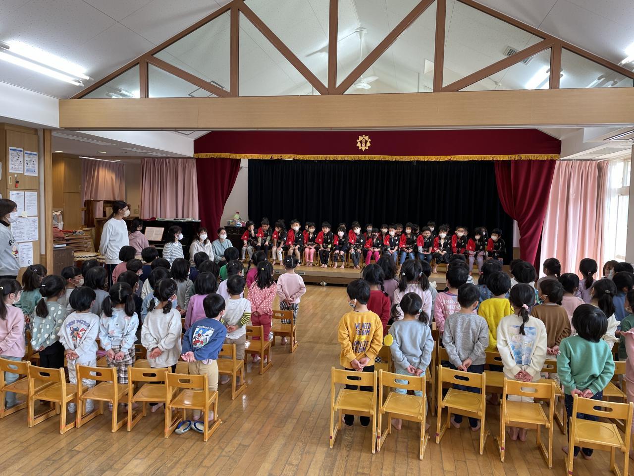🐘5歳児とのお別れ会を🐼3🦒4歳児クラスの子どもたちと一緒に行いました。今回参加できなかった0~2歳児クラスの子どもたちからのお別れメッセージを、保育者の楽しい出し物の中に取り入れ紹介したり、3・4歳児の子どもたちからは『君からもらった宝物の歌と贈る言葉』を贈ってもらったりして、5歳児クラスの子どもたちはとても嬉しそうでした。お礼に和太鼓の演奏をすると、みんな真剣なまなざしで聴いて大きな拍手をしていました。最後にファミリークラスに分かれて、0~4歳児クラスの子どもたちが協力して作成した⦅ペン立てと時間割表⦆のプレゼントにも、とても嬉しそうにしていた5歳児の子どもたちでした。