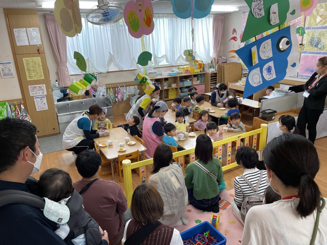 朝のおやつの様子をお家の方に見て頂きました。しっかり座って食べられましたね🍊🍎