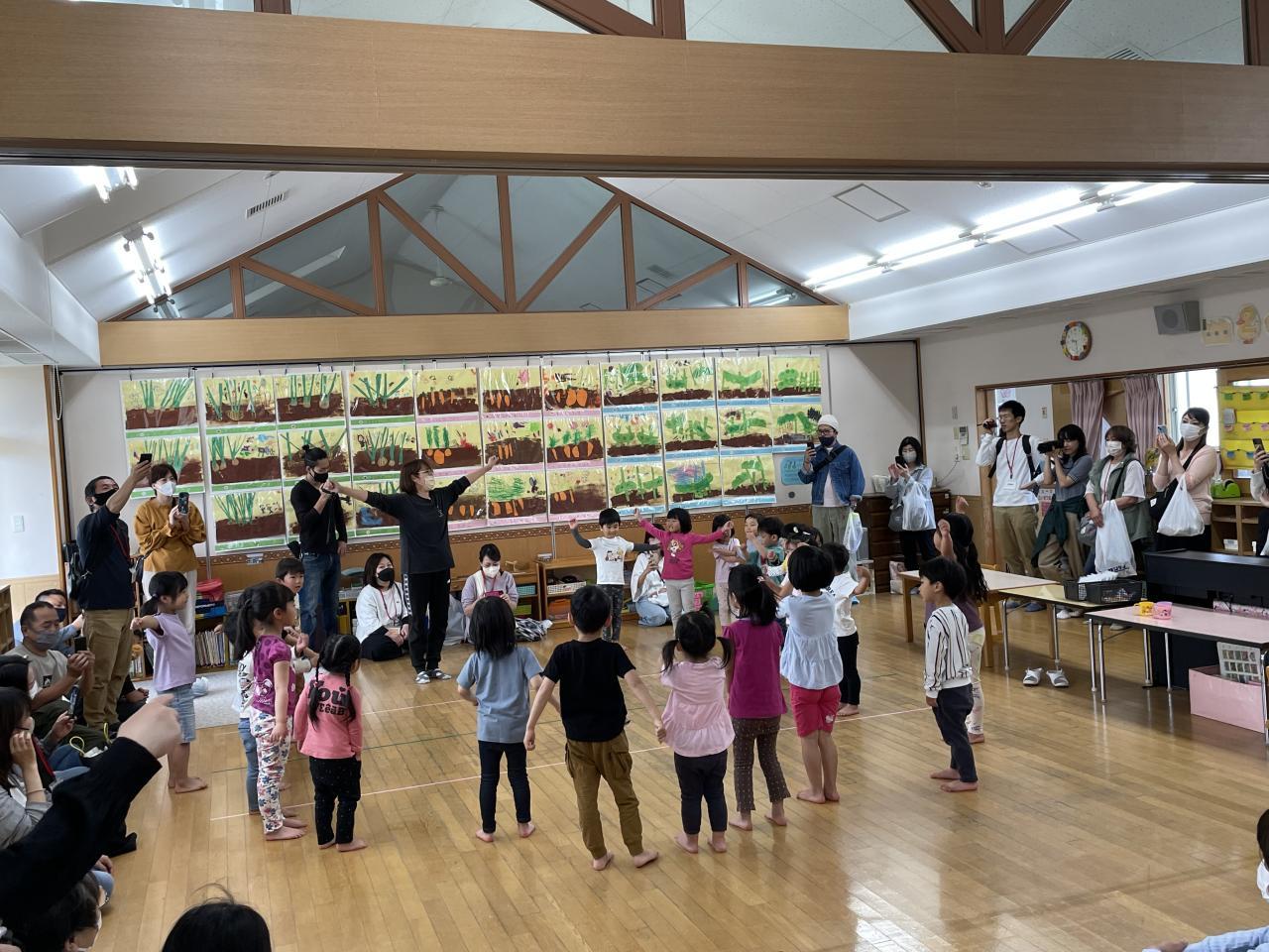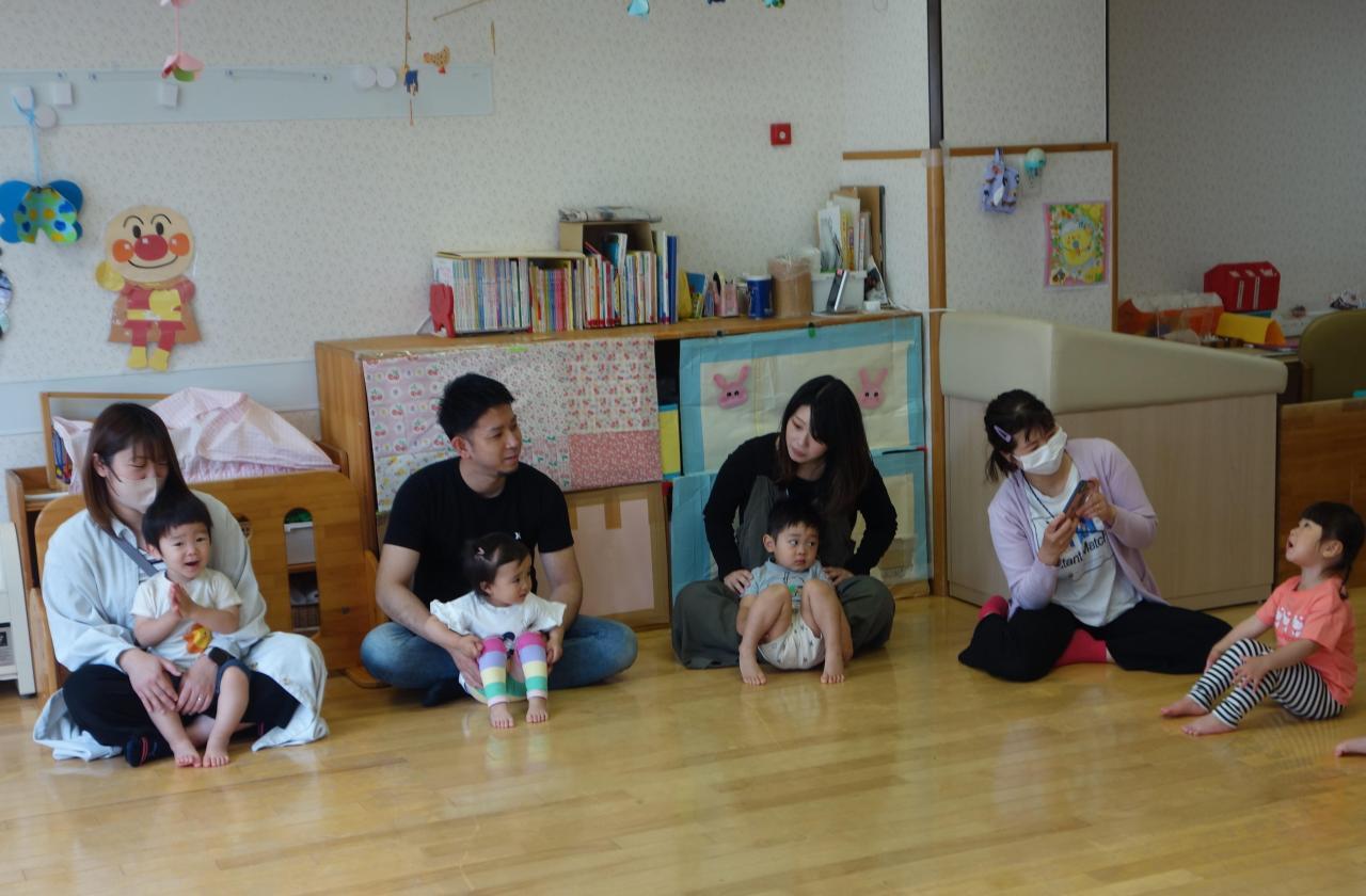 「いっぽんといっぽんで」の替え歌を使ってばなな組オリジナルのふれあい遊びを行いました。お家の人の膝の上でとても嬉しそうな子どもたちでしたね。